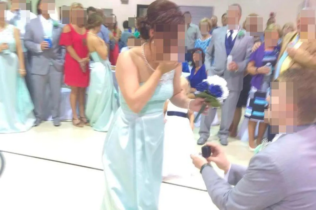 وتُظهر الصورة، التي التقطها أحد ضيوف حفل الزفاف، المُتقدم للخطبة ينحني على ركبة واحدة مع خاتم الخطبة في يده.