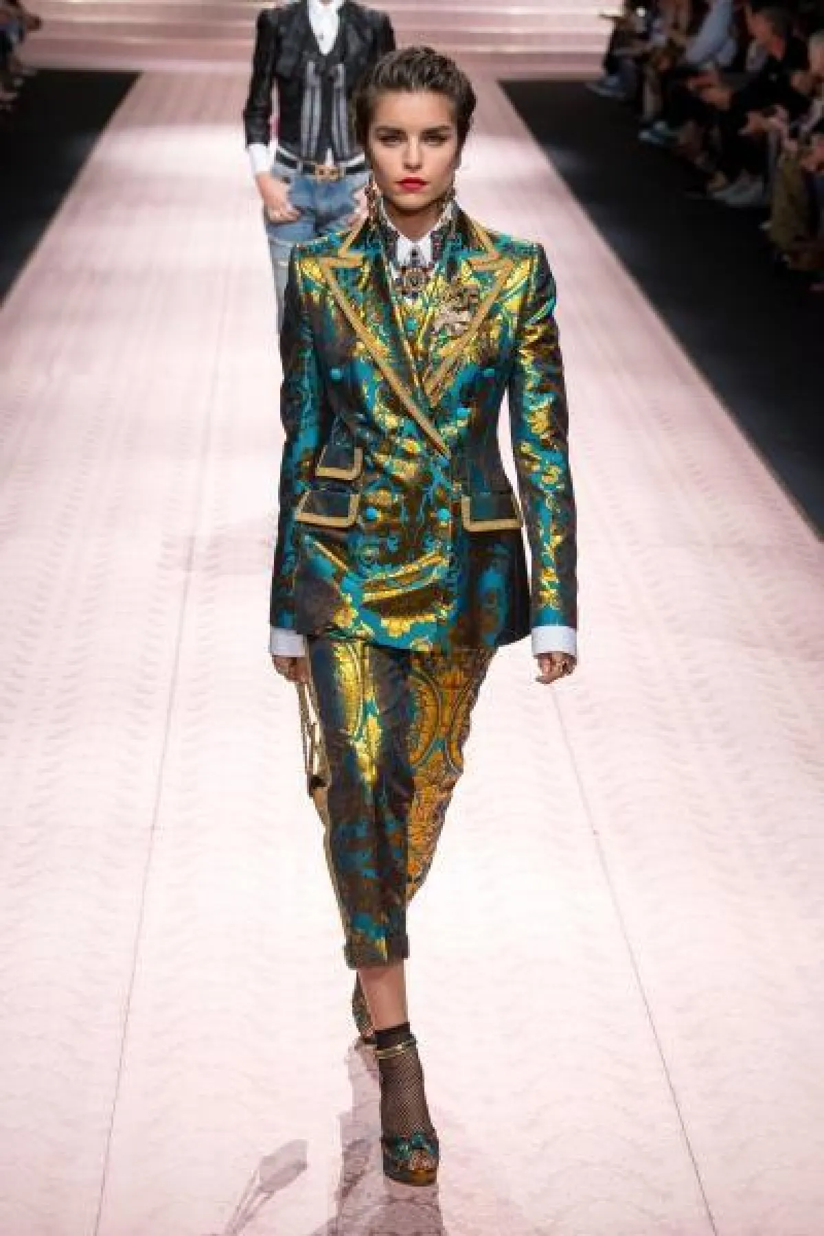 قدمت دار دولتشي آند غابانا Dolce & Gabbana باقة منوعة من بدلات السهرة التي تميزت بالطبعات اللامعة والياقات العريضة وزودت بعض الموديلات بصدرية قصيرة أشبه بالستايل الرجالي.