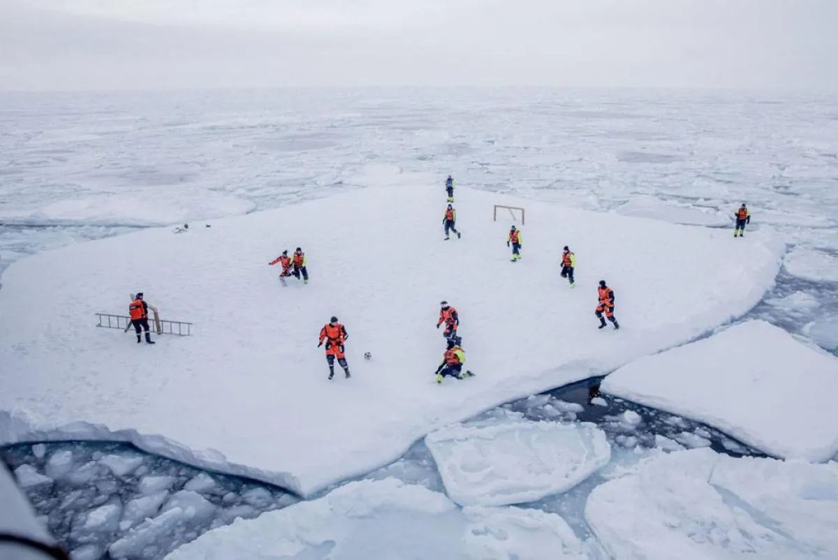 في جزيرة «غرينلاند» المتجمدة، والمعروفة بكونها أكبر جزيرة في العالم، وجد عدد من كوادر القوات البحرية النرويجية، وعلماء المعهد النرويجي للبحوث البحرية، ملعبهم الخاص بأغرب مكان قد يتصوره العقل. حيث أقاموه فوق قطعة جليد عائمة وسط قطع الجليد المترامية في كل مكان بالجزيرة. ونصبوا المرمى في مكانين متقابلين، ثم أقاموا مواجهاتهم الحامية، التي كانت كفيلة بمنحهم دفئاً كافياً وسط كل هذه الثلوج البيضاء المتجمدة.