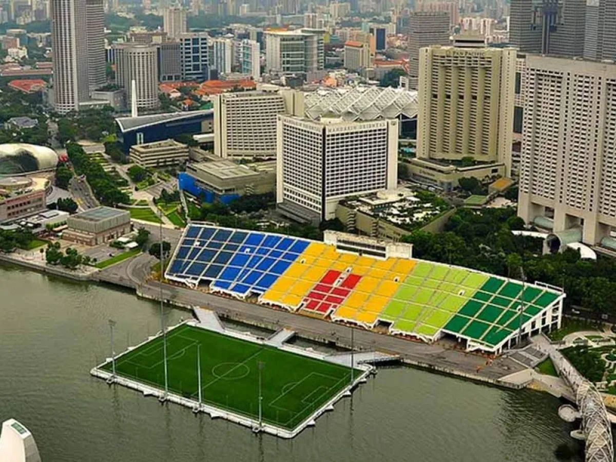 خلال العام 2007، تم في منطقة «مارينا باي» في سنغافورا، بناء أكبر ملعب طافٍ على سطح الماء في العالم، إنه ملعب «ذا فلوت مارينا باي»، المحاط بالمياه من كل مكان، باستثناء مكان واحد توجد فيه مدرجات المتفرجين، الذي يتسع لقرابة 30 ألف شخص. وكان هذا الملعب قد سبق له أن استضاف تظاهرات رياضية كثيرة من بينها الألعاب الأولمبية للشباب لسنة 2010.