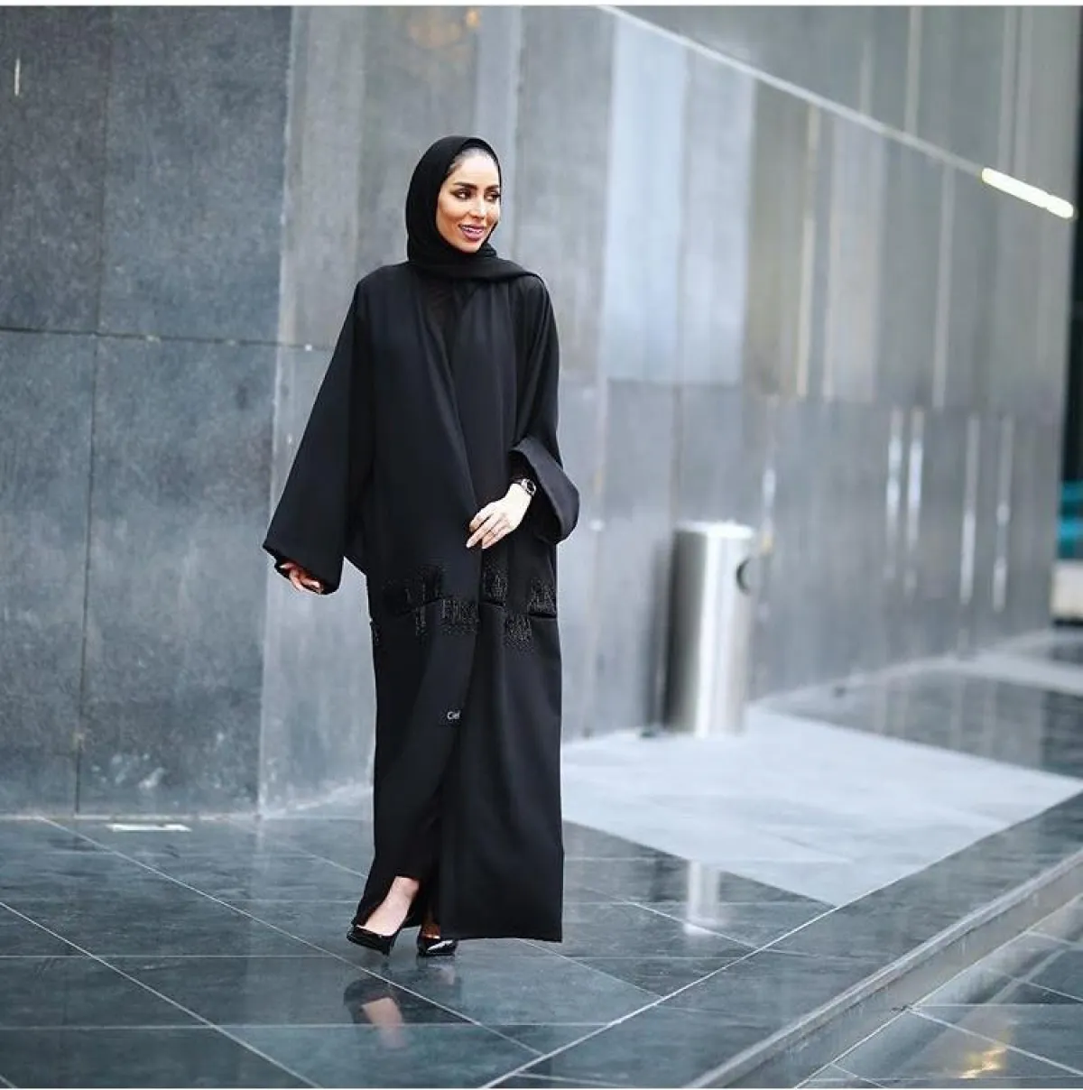 من التصميمات التي تناسب كل أوقاتِك، هو اختيار عبايه سوداء بسيطة من الممكن ألا يكون بها أيّ تطريزات، أو بها لمسات بسيطة كهذه العبايه السوداء المفتوحة من فاطيمة، مع لمسة بسيطة من رسومات الورود بالخيوط السوداء، لاطلالة تجمع بين النمط العصري والكلاسيكي، سوف تناسب نهار العيد مع الأحذية الأرضية، ومن الممكن أن ترتدي العبايه ذاتها مع الكعب العالي بسهرات العيد.