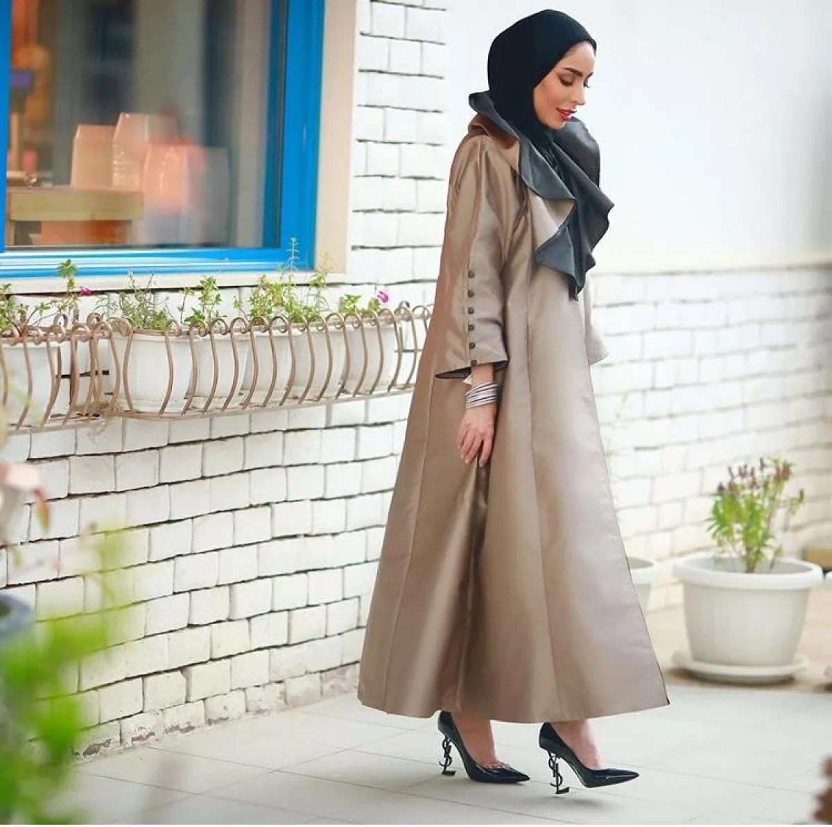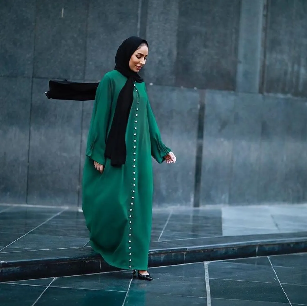 عادت موضة التصميمات ذات الأزرار الأمامية، تسيطر على عالم الموضة من جديد، مستوحاة من فترة الثمانينيات والتسعينيات، فلِمَ لا تعتمدينها مع العبايات كهذا الموديل باللون الاخضر العشبي المميز من الفاشينيستا فاطيمة، مع الأزرار الأمامية باللون الأبيض، وحجاب وحذاء باللون الاسود لاطلالة متناسقة وكلاسيكية بالوقت نفسه.