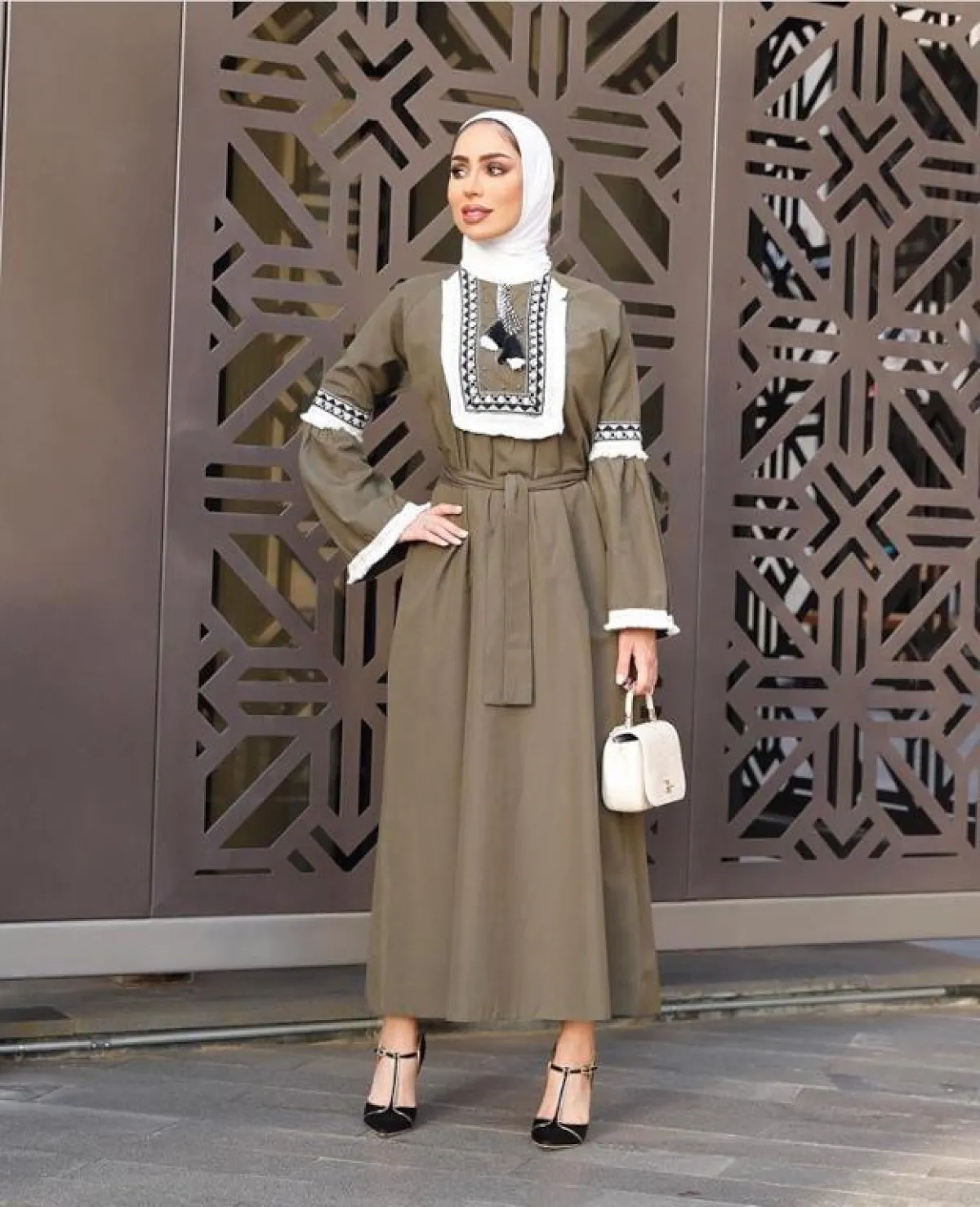 لا يمكن أن نتحدث عن موديلات العبايات المتنوعة من دون أن نذكر العبايات مع حزام الخصر، وبالطبع تدرك الفاشينيستا فاطيمة أهمية هذه القطعة بخزانتِك، من الممكن أن تختاري الحزام العريض مع العبايات الكتان، لاطلالة رشيقة ومميزة، كهذا اللوك بالعباية الرمادية اللون مع تطرزيات الورود السوداء، نسقت معها حزام الخصر باللون البيج.