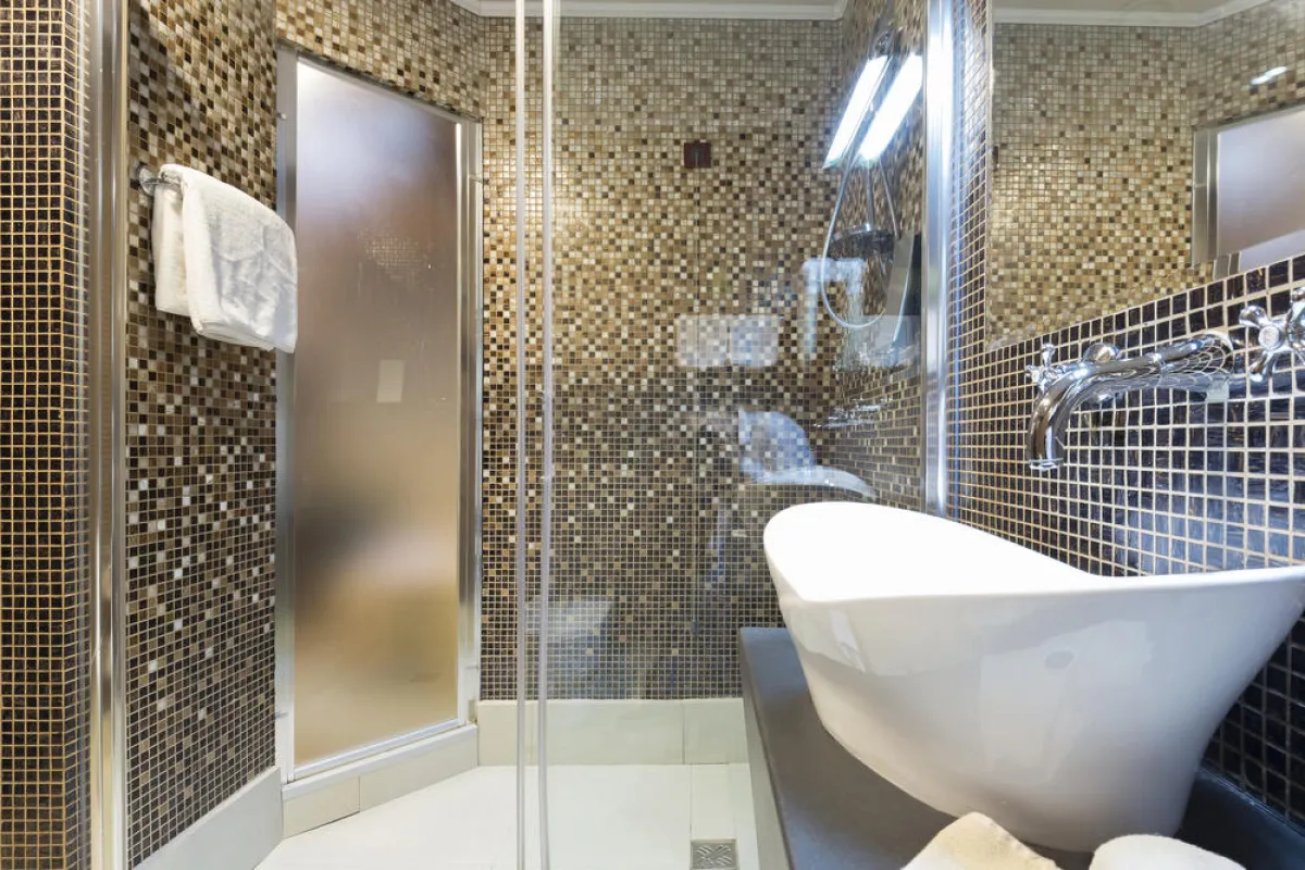 • لا يُفضَّل استخدام الموزاييك بكثرة في المساحة، بل الاكتفاء بتثبيته في أماكن محددة، وعلى الجدار بصورة تتجاوز الأرضيَّة، أو على هيئة إطار حول حوض الغسل. ويُحبَّذ أن يكسو مساحة الـ"دشّ".