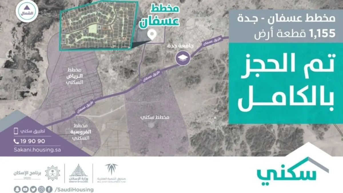 اكتمل حجز الأراضي المجانية في مخطط عسفان السكني شمال محافظة جدة، بعد ثلاثة أيام من إطلاق عمليات الحجز في المخطط، وذلك وفقاً لما كشف عنه اليوم برنامج "سكني" التابع لوزارة الاسكان.