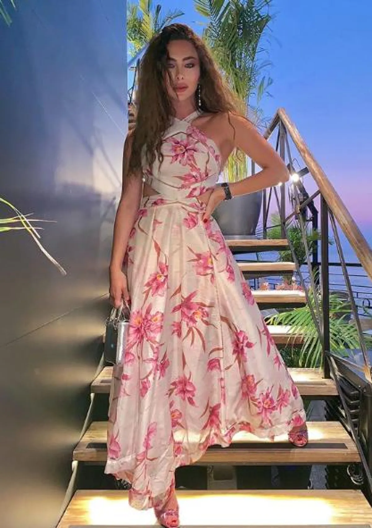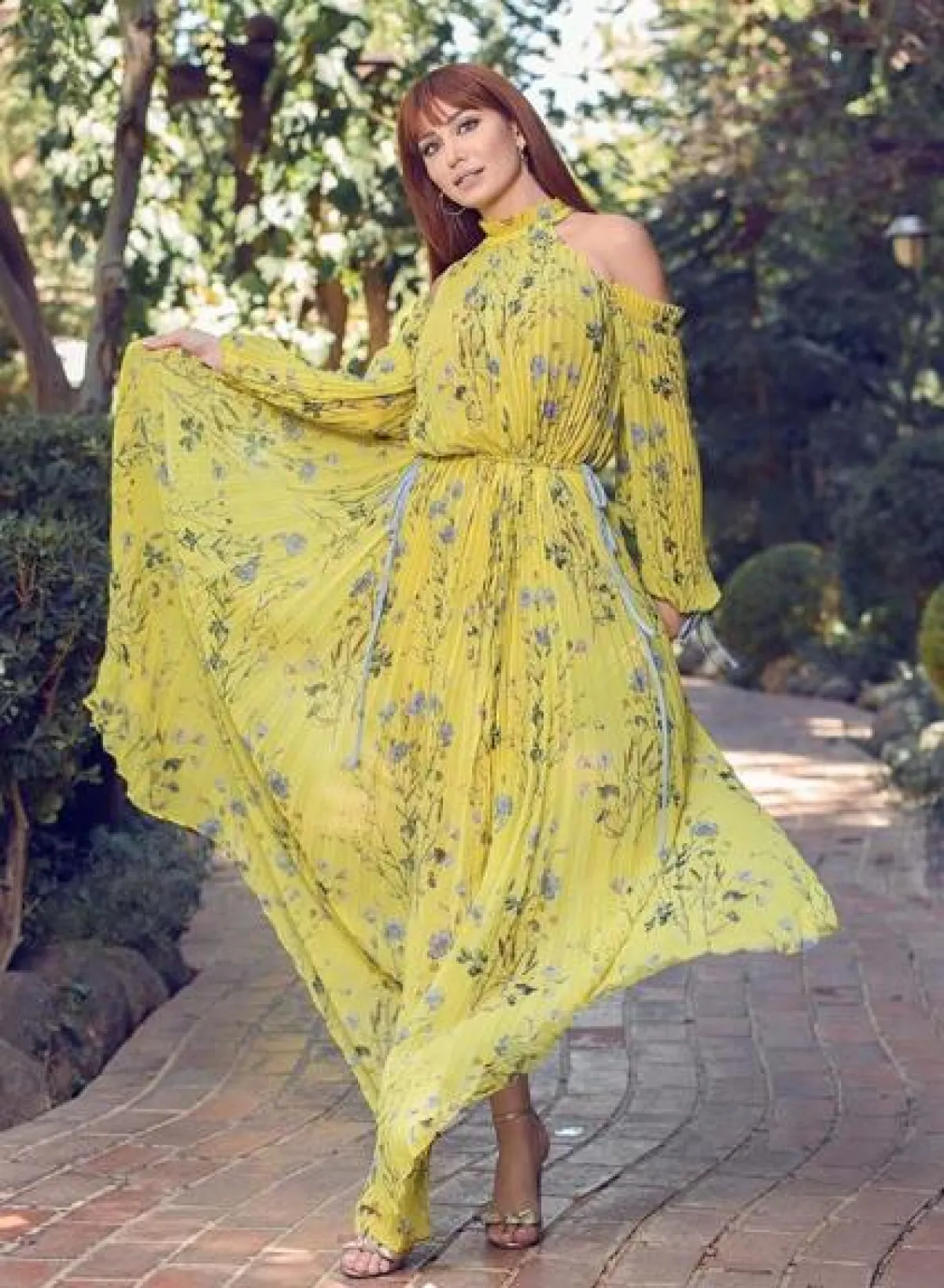 هبة نور اختارت لأحد المشاوير الصيفية، فستان ماكسي باللون الأصفر موردًا بورود زرقاء ناعمة، أكتافه مكشوفة وأكمامه طويلة، وقد اختارت معه صندلًا بكعب عالٍ باللون الفضي الميتالك، وأقراطًا ناعمة.