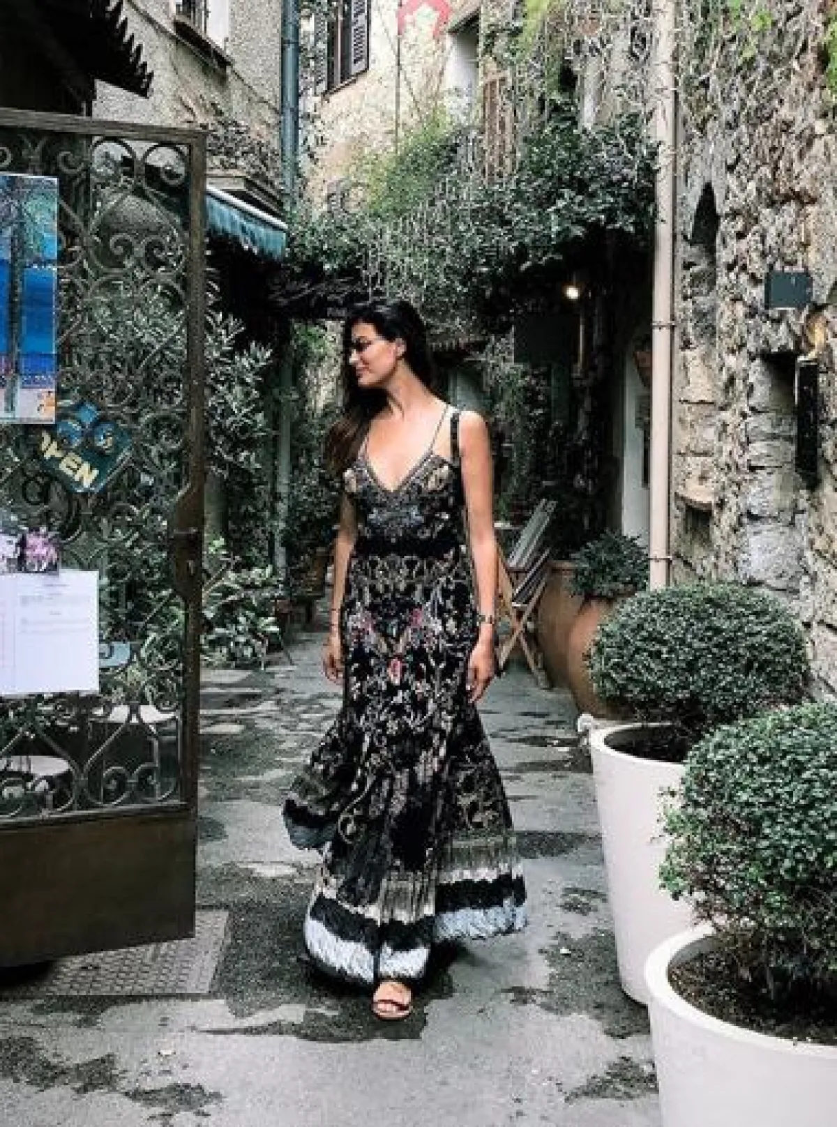 تختار كارمن سليمان الاطلالات الناعمة ذات الطابع الأنثوي، ومنها هذا اللوك المستوحى من الخمسينيات في فستان مورد ميدي، قصته مكشوفة الأكتاف من الأعلى، ومحدد الخصر بحزام قماشي أسود، وتنورته كلوش مزينة برسومات الورود، وقد نسقت معه صندلًا بكعب عالٍ أسود.