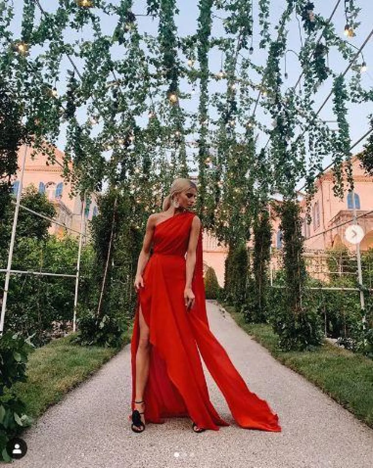على خطى ما سلف، تألقت Caroline Daur أيضًا بفستان عصري أوف شولدر باللون الأحمر، يتميز بفتحة طويلة.