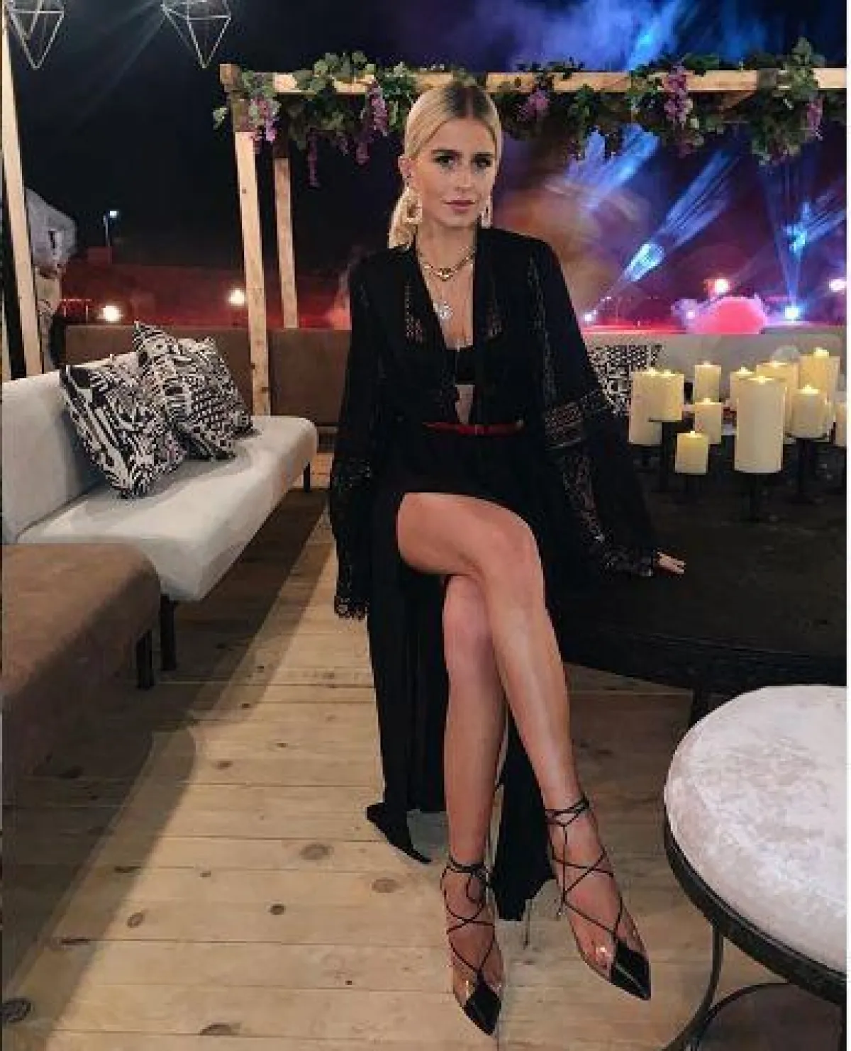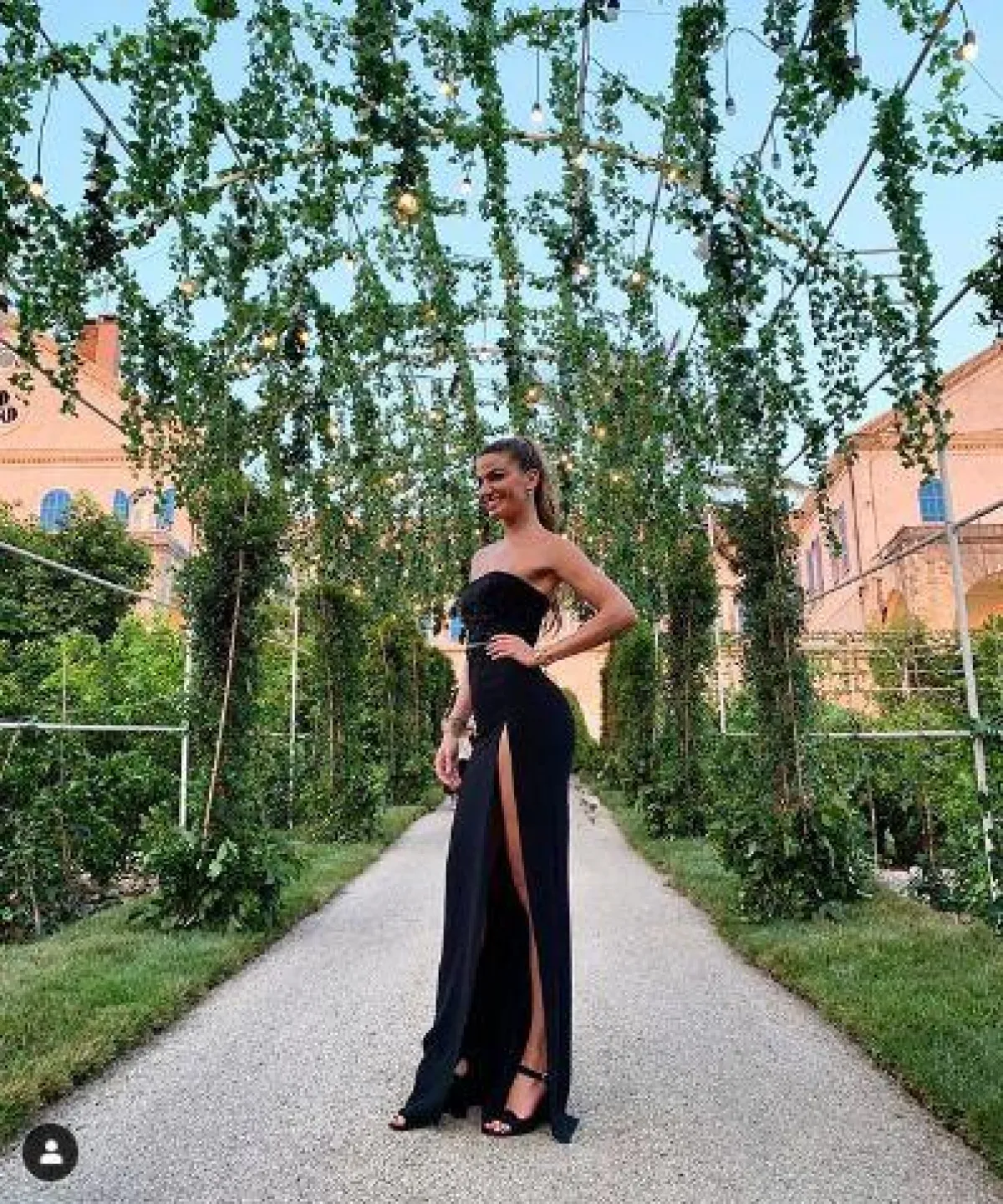 حضرت عارضة الأزياء الإيطالية Bianca Brandolini حفل الزفاف بفستان أسود ضيّق من دون أكمام مع فتحة طويلة، ومزين ببعض الحبيبات البرّاقة في قسمه العلوي.