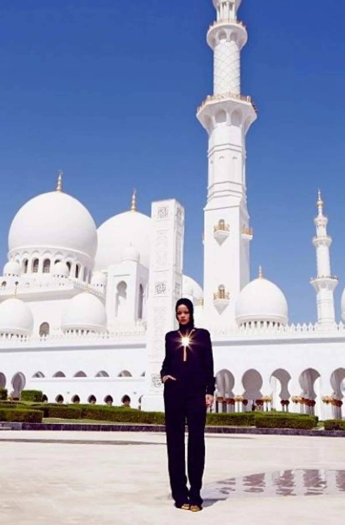 من جانب آخر، أثارت Rihanna موجة من البلبلة، بعد أن نشرت عبر حسابها على أنستغرام صوراً لها محجبة أمام أحد مسجد الشيخ زايد في أبوظبي، يأتي ذلك بعد أن سبق وشاهدنا Madonna بالخمار.