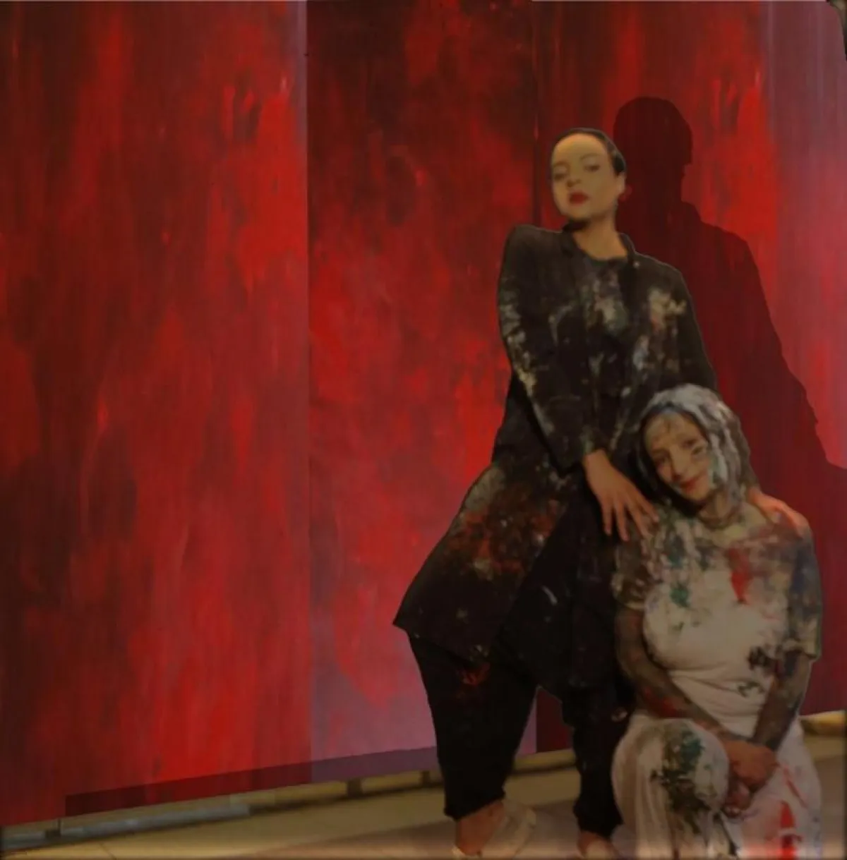 وتزامنت لحظة البهجة مع اللون الأخضر واللطخ به على جسم الممثلة. ولفتت إلى أن العرض شهد لحظة أخرى مهمة تمثَّلت في موسيقى حزينة مع بروز اللون الأسود، وذلك بالتزامن مع الحركات العضوية في العرض.