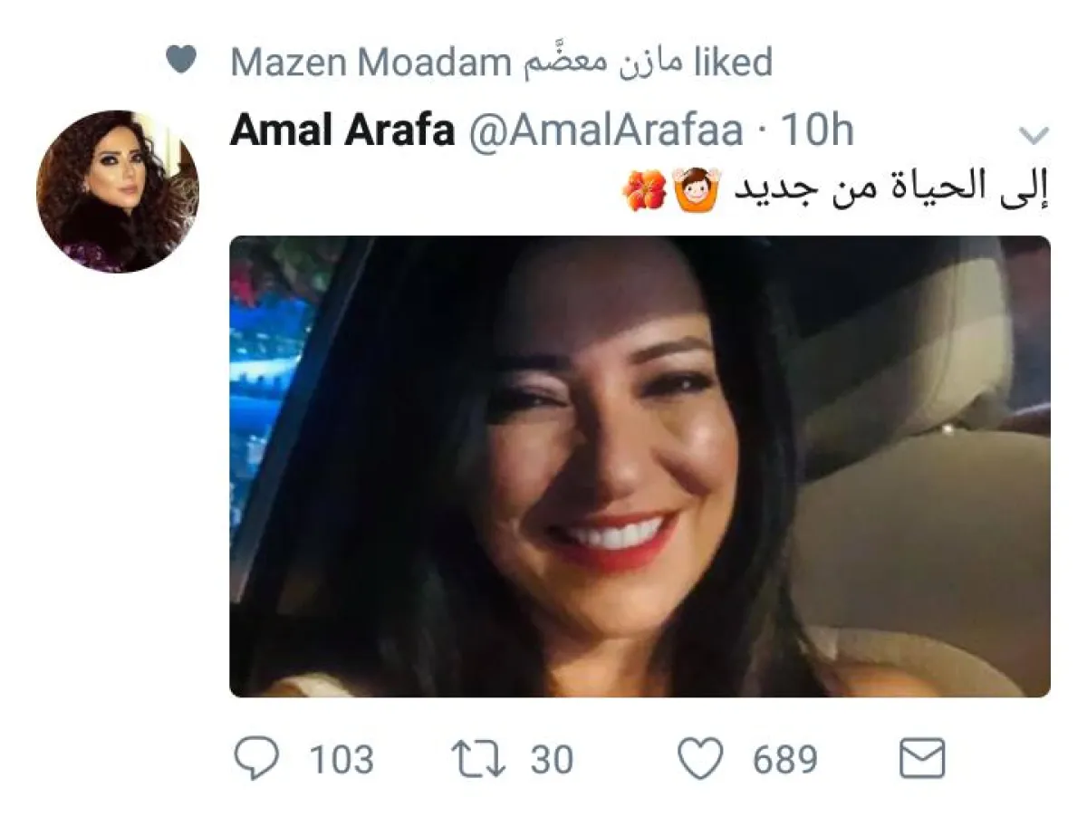 تعليق أمل عرفة، جاء خلال تواصل "سيدتي نت" معها بعد نشرها تغريدة كتبت فيها "إلى الحياة من جديد".