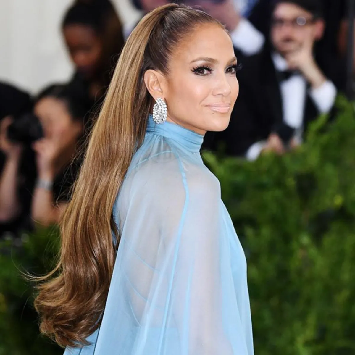 في سهرة الـMet Gala من هذا العام، تألقت جنيفر لوبيز بتسريحة ذيل الحصان مع خصلة شعر بطول مبالغ فيه. هذه التسريحة جاءت مناسبة لإطلالتها بالفستان الأزرق ذات الياقة المرتفعة.