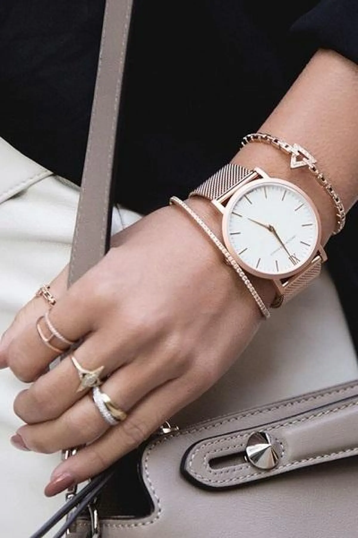 - لا تعتمدي ساعات الذهب الفاخرة وحدها، حيث إنه من أساسيات عالم الموضة أن تنسقي معها مجوهرات ناعمة وأساور رفيعة تليق بها، وخواتم ناعمة مميزة.