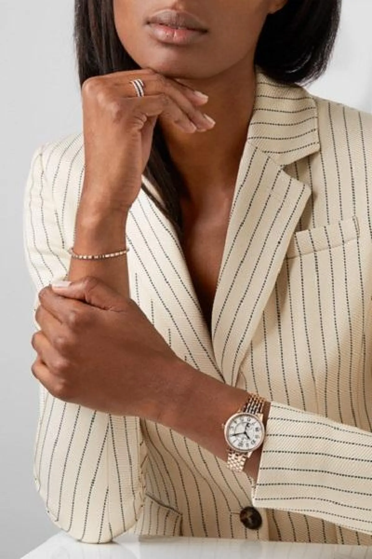 - حاولي دائماً تنسيق لون الساعة مع مجوهراتك؛ حيث ننصحك باختيار الساعة الذهبية مع المجوهرات باللون الذهب الأصفر. أما إذا أردتِ ارتداء مجوهرات ذهب أبيض، فمن المفضّل أن تكون الساعة بذات اللون.