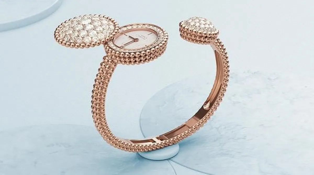 اخترنا من مجموعة Perlée لدار فان كليف آند أربيلز Van Cleef& Arpels ساعة فاخرة من الذهب الوردي عيار 18 قيراطاً. تتميز هذه الساعة بتصميمها على شكل سوار، وبقالبها المصمم من اللؤلؤ الطبيعي، وهي مرصعة بحبات الألماس.