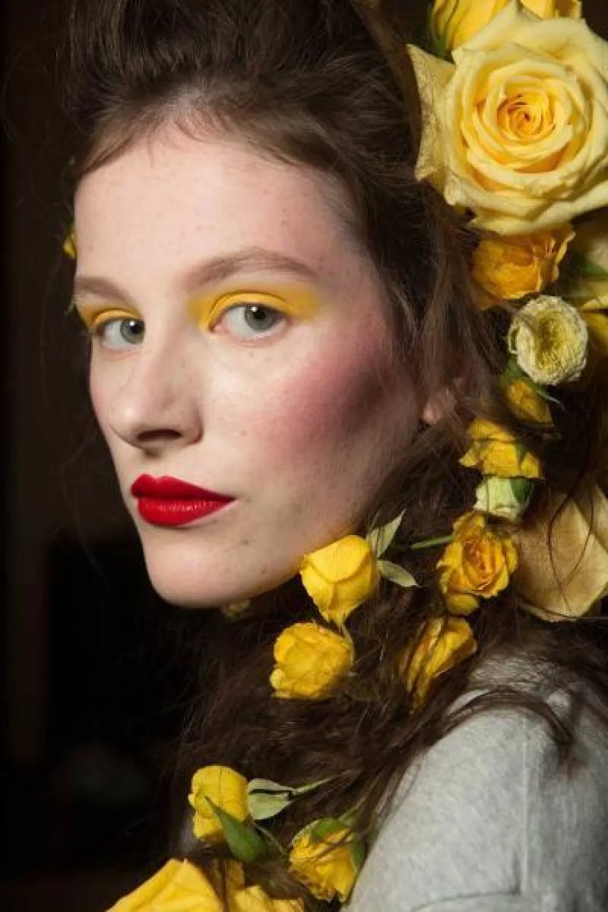 كما ويمكنكِ اعتماد تسريحة الشعر المرفوع بأسلوب الكعكة المتناثرة، وتزيينها بالورود الملوّنة والجميلة، كتلك التي برزت في عرض مارك دي فانسينزو Marc De Vincenzo