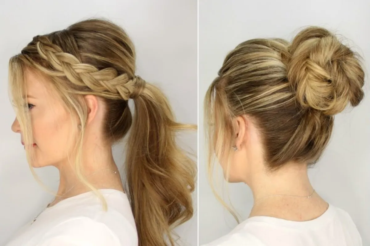 هذه التسريحة عصرية وشبابية، وستمنحك مظهراً حيوياً خلال الأجواء الحارة، وهي لا تحتاج الى الكثير من الوقت لتنفيذها، إذ يكفي أن تقسمي شعرك إلى نصفين بطريقة أفقية، ومن ثم لمّ النصف العلوي بأسلوب الكعكة. واتركي النصف السفلي منسدلاً على ظهرك وكتفيك، وبعض الخصلات منسدلة على الوجه.