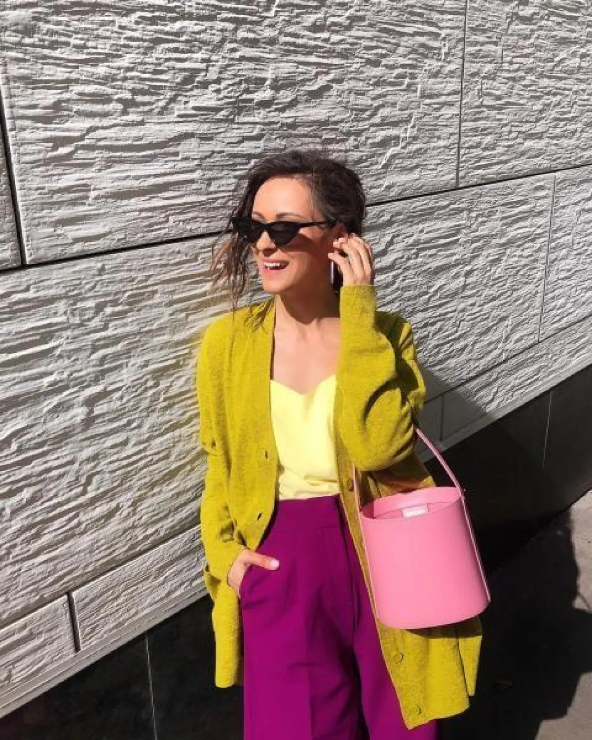 جربت إلينا المزج بين اللون الأصفر والفوشيا والوردي معاً في إطلالة واحدة، في الحقيقة الجرأة التي تتحلى بها يستطيع أي شخص أن يعترض عليها لأنها حقاً جذابة للغاية، خصوصاً محبي الألوان الزاهية.