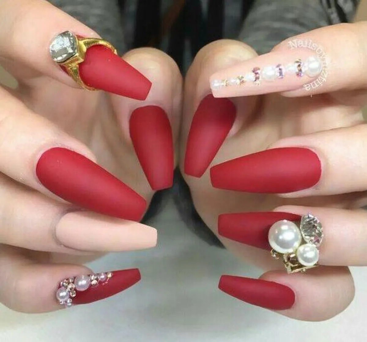 يعد الأحمر المطفي مع النيود خياراً رائعاً للعيد، لا سيما إن زينت أظافرك بأكسسوارات ناعمة تضفي الجمال والفخامة على أظافرك. ولتنفيذ أفضل مزيج بين المناكير الأحمر المطفي والمناكير النيود، طبقي الأحمر المطفي على كامل أظافرك باستثناء ظفر واحد تضعين عليه المناكير النيود. بعدها، زيني أظافرك بالأكسسوارات.