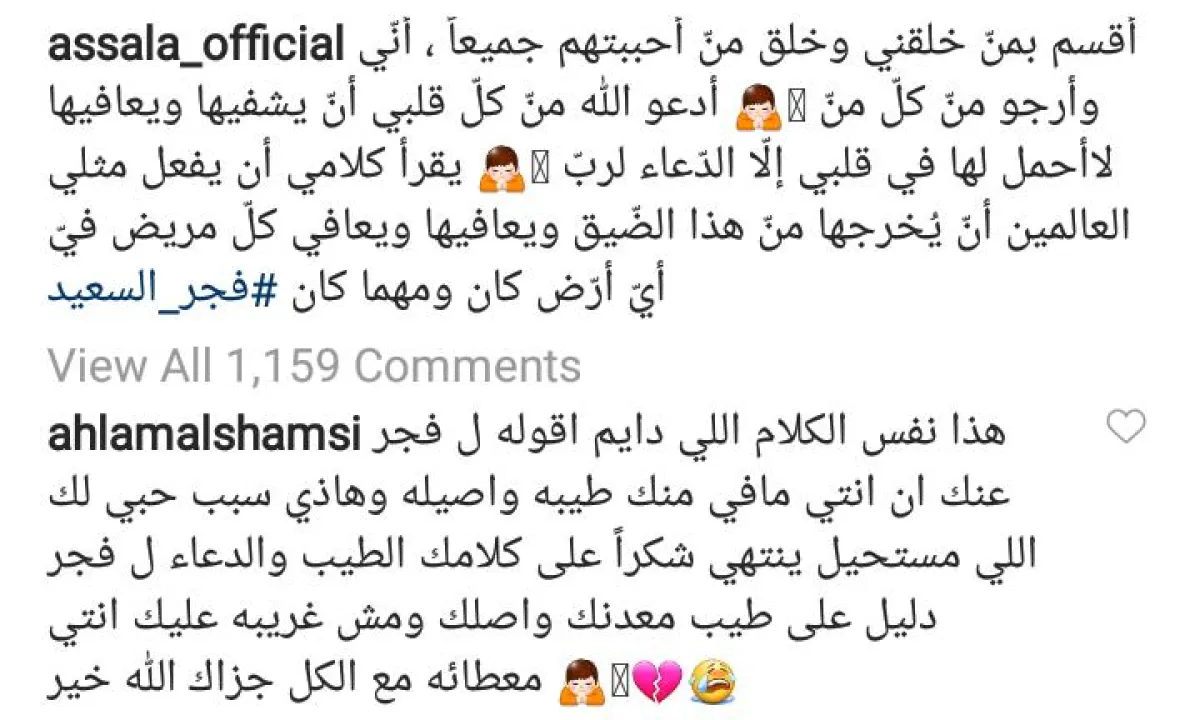 أصالة تمنت الشفاء لـ فجر السعيد، وأقسمت بالله أنها تقول كلامها من كل قلبها، ودعت كل من يقرأ تغريدتها أن يفعل مثلها، مشيرة إلى أنها لا تحمل في قلبها سوى الدعاء لرب العالمين من أجلها، طالبة منه أن يخرجها من الضيق كما كل شخص مريض.