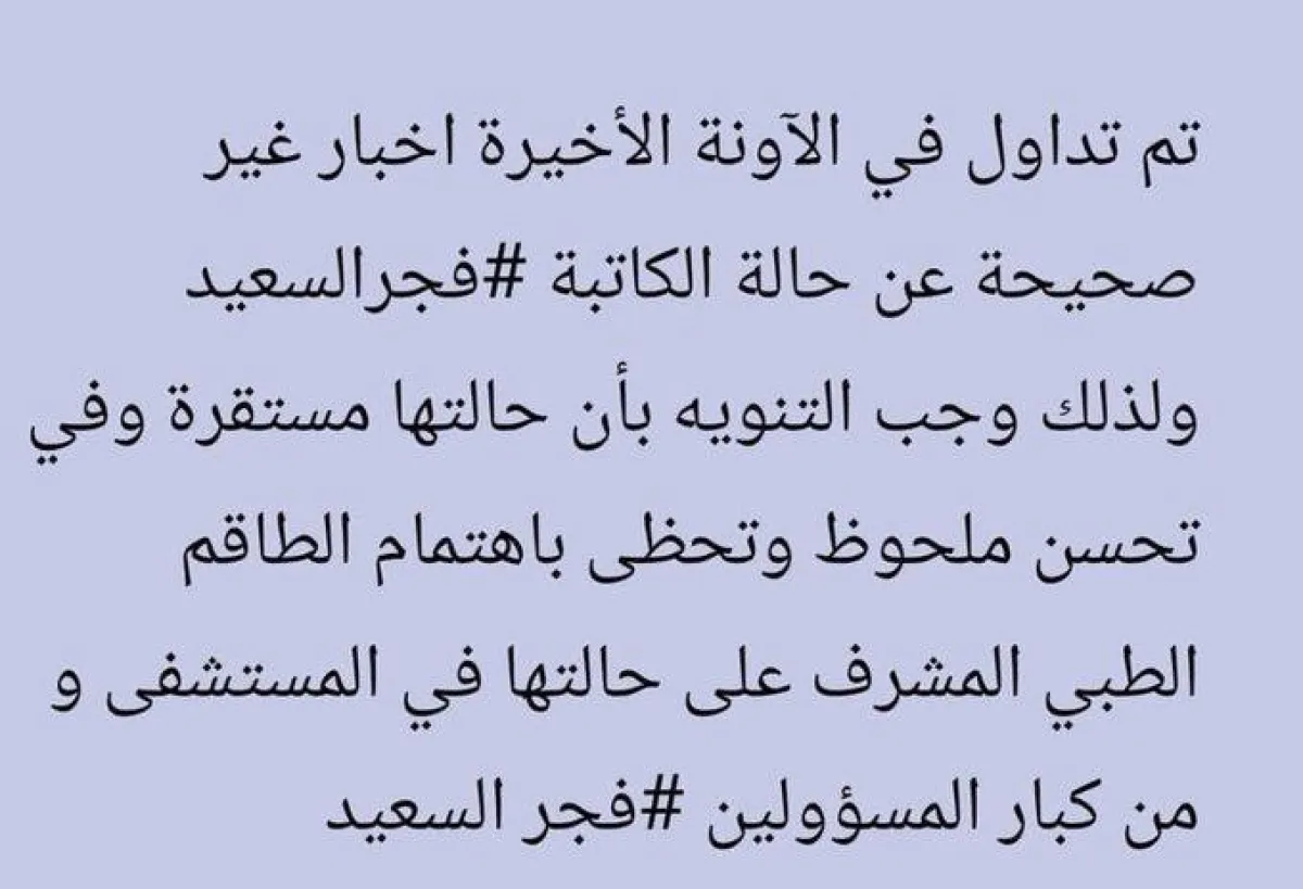 وذكرت في حسابها: تم تداول في الآونة الأخيرة اخبار غير صحيحة عن حالة الكاتبة فجرالسعيد ولذلك وجب التنويه بأن حالتها مستقرة وفي تحسن ملحوظ وتحظى باهتمام الطاقم الطبي المشرف على حالتها في المستشفى ومن كبار المسؤولين.