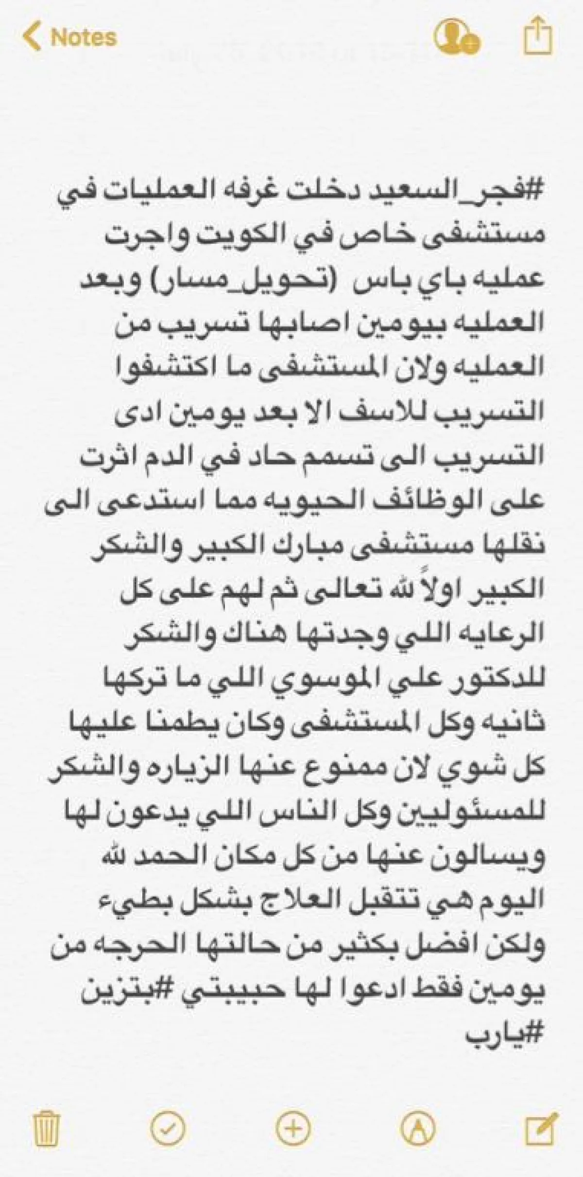 من ناحية أخرى، نشرت الفنانة أحلام بوست تشرح فيه حقيقة مرض فجر السعيد وآخر مستجدات وضعها الصحي الحالي، مشيرة إلى أنه حصل تسريب بعد خضوعها لعملية تحويل مسار، ولكن لم يتم اكتشافه إلا بعد يومين، نتج عنه تسمم في الدم أثّرَ على الوظائف الحيوية، وعلى إثرها تم نقلها إلى مستشفى مبارك الكبير حيث تحظى حالياً بالرعاية المطلوبة، وهي تتقبل العلاج بشكل بطيء، ولكن وضعها أصبح أفضل مما كان عليه قبل يومين.