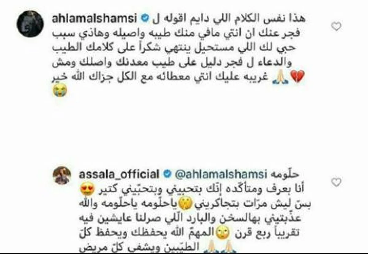 بعد أن غردت الفنانة أصالة للإعلامية فجر السعيد، متمنية لها الشفاء ومؤكدة أنها لا تحمل في قلبها تجاهها أي ضغينة، وتعليق أحلام على تغريدتها التي أشادت بموقفها، وتأكيدها أنها إنسانة طيبة وتحبها من كل قلبها، ردت أصالة على تغريدة أحلام، مشيرة إلى أنها متأكدة من حبها لها، ولكنها تساءلت "ليش مرات بتجاكريني"، وموضحة أنها تشعر بالاستغراب من مواقفها التي تتأرجح بين "الساخنة والباردة" طوال 25 عاماً الماضية، متمنية أن يحفظها الله والشفاء لكل مريض.