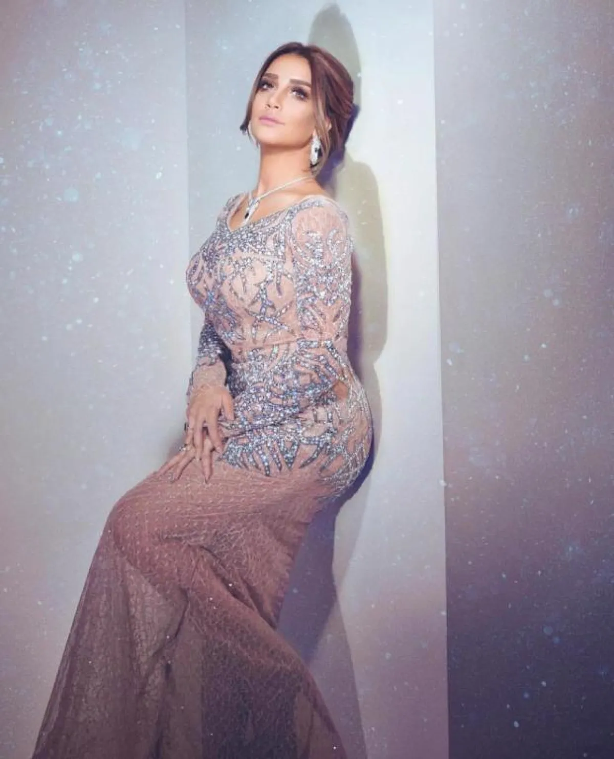 ونسَّقت العنبري ثلاثة فساتين متشابهة، أحدها مُحدَّد الخصر، وشفاف من الأسفل، ومزيَّن بنقشة فضية، وأكمام شفَّافة، ورفعت شعرها بتسريحة بسيطة، والثاني شبيه به، بنقشة فضية، وأكملت مظهرها بالشعر "الويفي" الذي زيَّن كتفيها، وفي الإطلالة الثالثة، ارتدت فستاناً بالتصميم ذاته، مزيَّناً باللمعة السوداء، وتركت شعرها منسدلاً.
