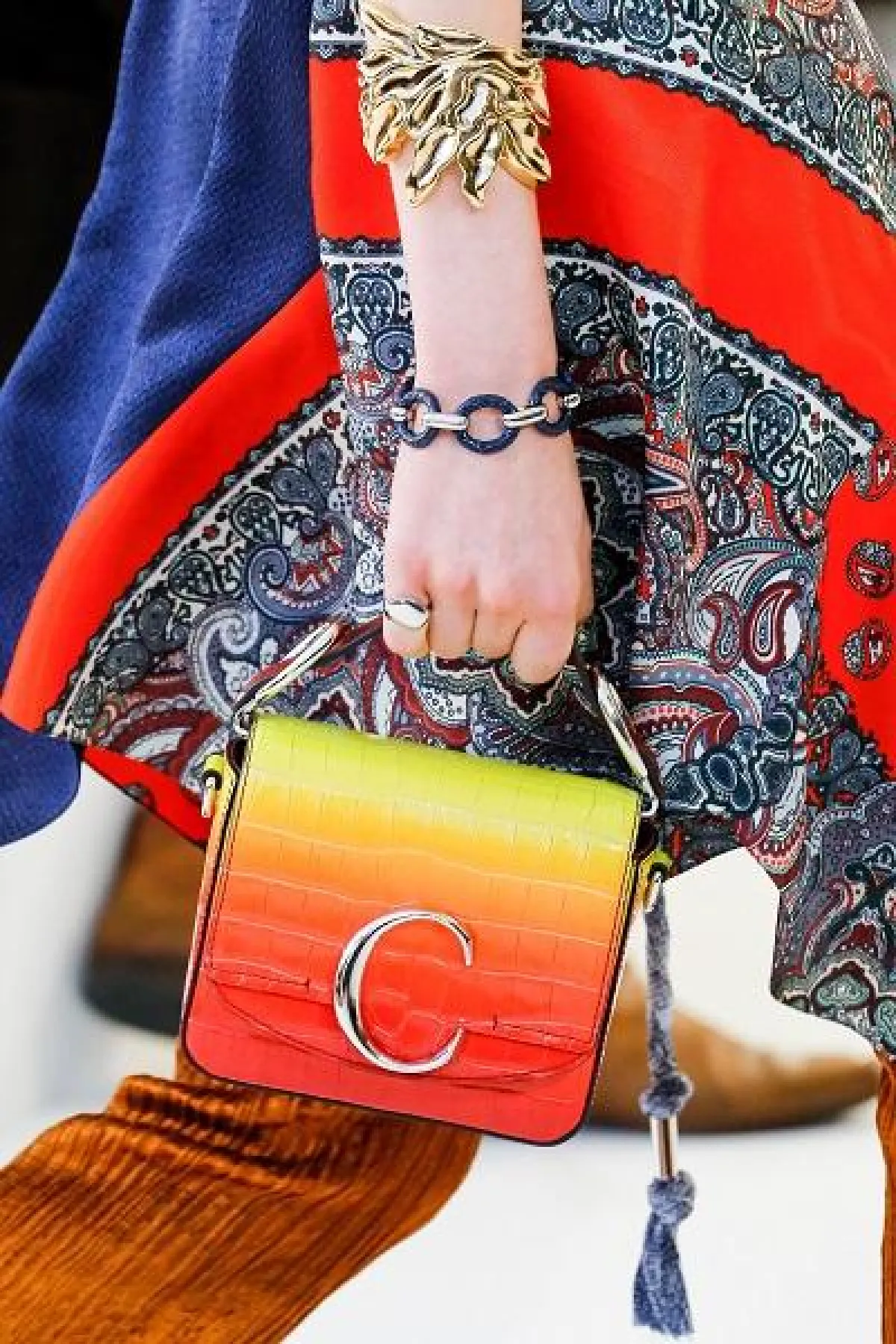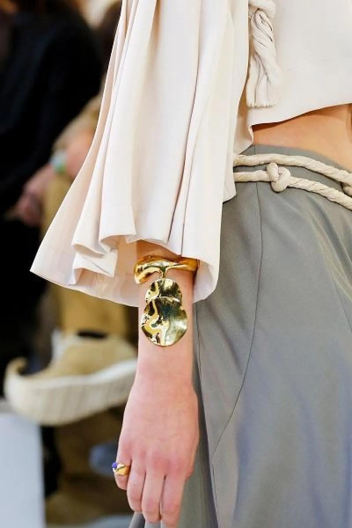 جاءت الأساور الكبيرة الذهبية بارزة وذات تصاميم عصرية سادة لدى دار كلويChloe فأغنت المعصم وزادت من رقته وبروزه.
