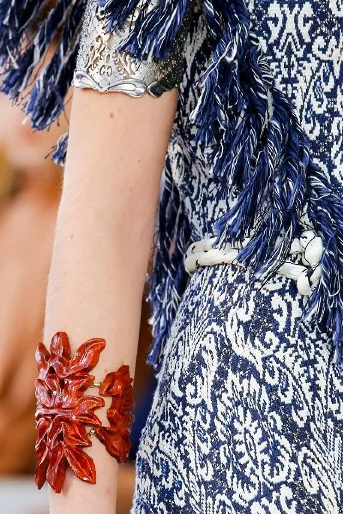 أما دار شانيل Chanel فقدّمت أساور كبيرة ذهبية فاخرة مرصّعة بحبيبات الخرز الملون واللؤلؤ مبرزةً اسم العلامة الراقي.