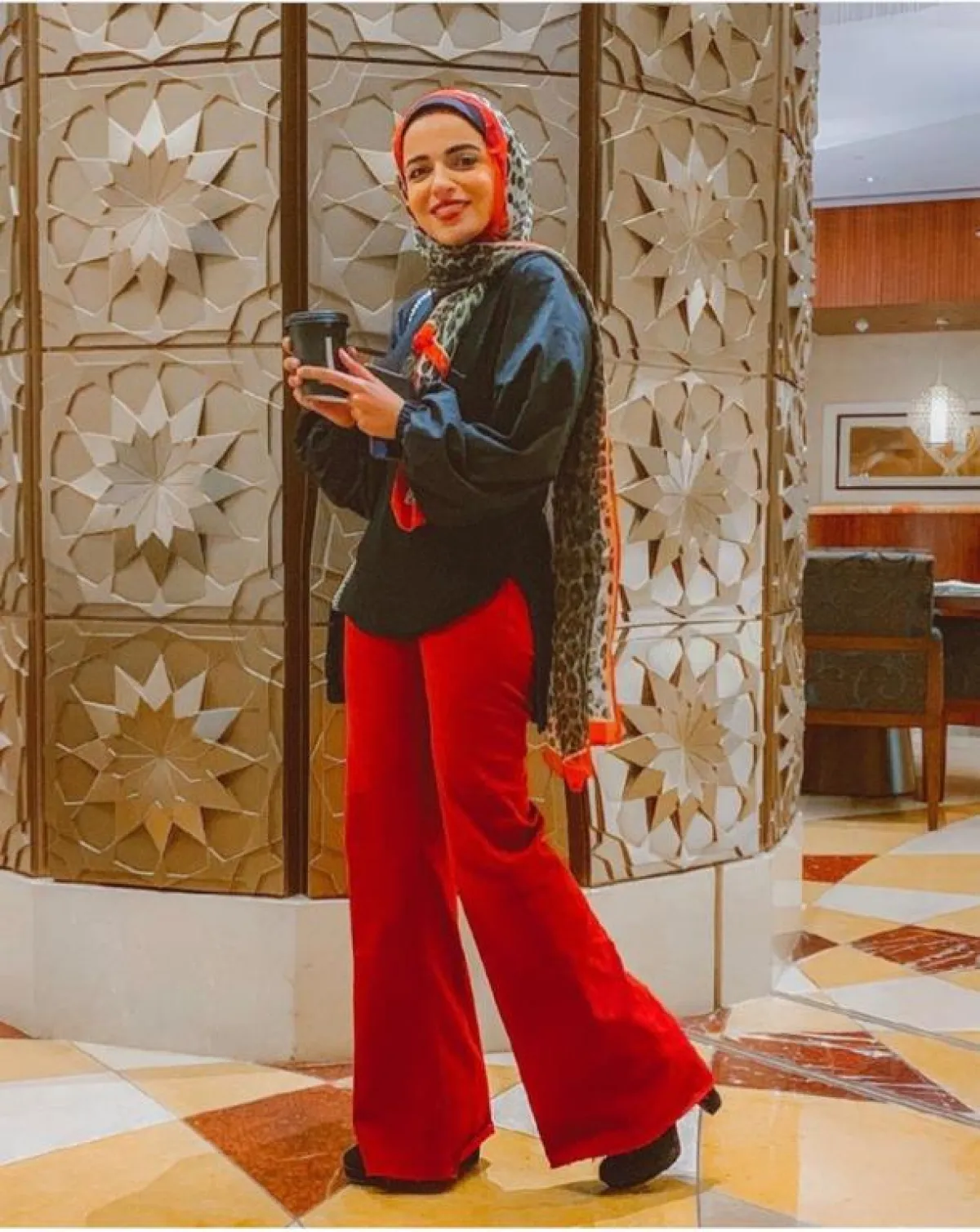 يمكنك اختيار هذا البنطلون الواسع بلونه الأحمر الجريء من سهر فؤاد، المستوحى من فترة الستعينيات، وهو إحدى القطع الأنيقة التي ننصحك بأن تكون موجودة بخزانتك، نسقيه بكل بساطة مع القميص الطويل، ومن الممكن أن تعتمدي هذا الحجاب برسومات جلد النمر، لإطلالة أكثر جرأة.