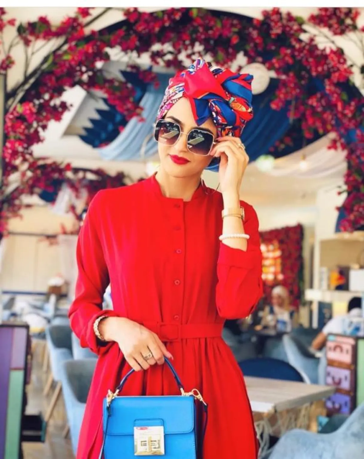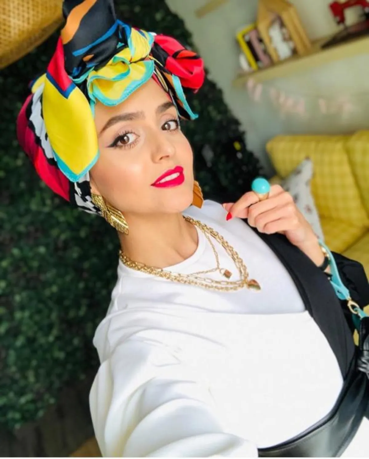 هذه الدرجة من الألوان الباردة كالبيبي بلو، تخدع العين بطريقة عجيبة، فحتى لو لم تكن متناغمة مع ملابسك لن تشعري بذلك، والدليل على ذلك هذا اللون البيبي بلو للفة التوربان التي اعتمدتها غادة عثمان مع الفستان باللون الأصفر، لإطلالة بدت منعشة ومميزة لفصل الصيف.