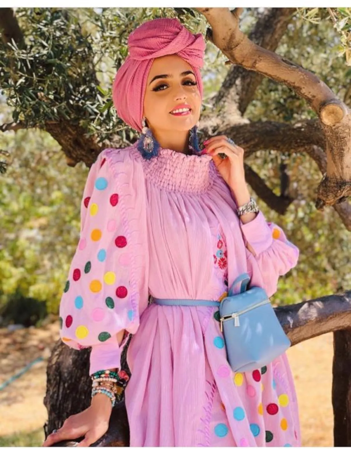 من الممكن أن تعتمدي على الحجاب باللون الروز الناعم، والذي يعتبر خيارا محايدا سيناسب إطلالتك بالألوان الفاقعة أو البسيطة، نسقته غادة مع فستان بدرجات الروز أيضًا، منقط بالألوان الفاقعة.