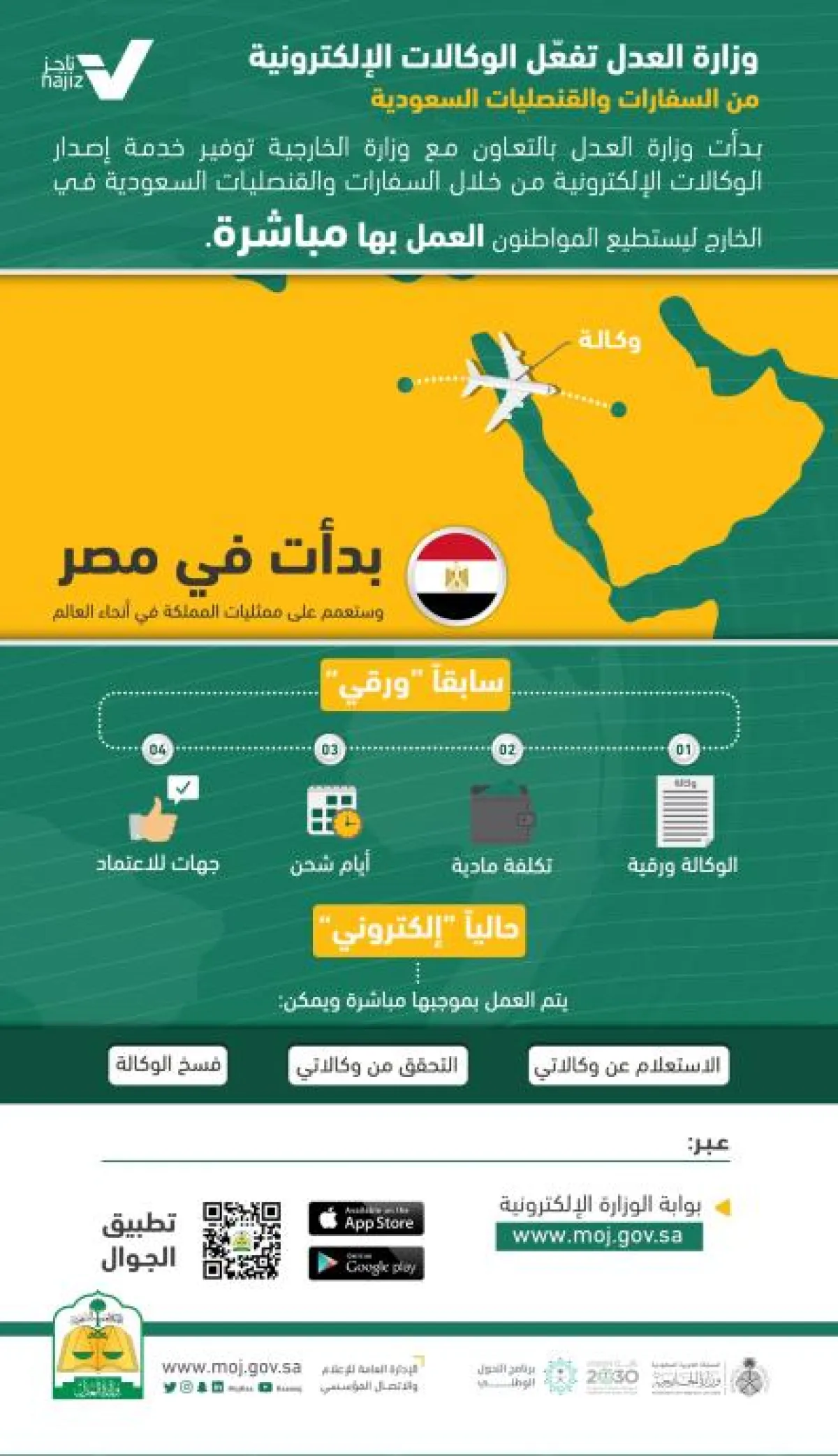 وبعد أن كان إصدار الوكالة في السابق من السفارات والقنصليات ورقياً ويكلف المستفيد وقتاً ومالاً، إذ بعد أن تصدر له الوكالة يجب عليه أن يرسلها بالبريد التقليدي إلى السعودية، لتصدق من وزارة الخارجية ومن ثم وزارة العدل، دون أن يستطيع فسخها إلكترونياً، بينما أصبح بإمكان الوكيل الآن العمل بموجبها فور صدورها إلكترونياً من الممثليات السعودية، ويمكن للجهات المتعاملة مع الوكيل التحقق من الوكالة عبر موقع وزارة العدل، كما يستطيع الموكل الاطلاع عليها من خلال خدمة الاستعلام عن وكالاتي من خلال بوابة وزارة العدل وتطبيقها على الجوالات الذكية، كما يمكنه فسخها إلكترونياً عند انتفاء الحاجة لها.