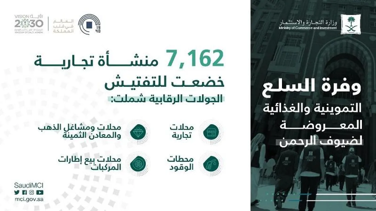 ونفذت الفرق الرقابية بالوزارة جولات ميدانية استباقية خلال الأسبوعين الماضيين لمراقبة مؤشرات الوضع التمويني، والتأكد من وفرة المعروض بما يحقق كافة احتياجات ضيوف الرحمن والسكان في مكة المكرمة والمدينة المنورة والمشاعر المقدسة.