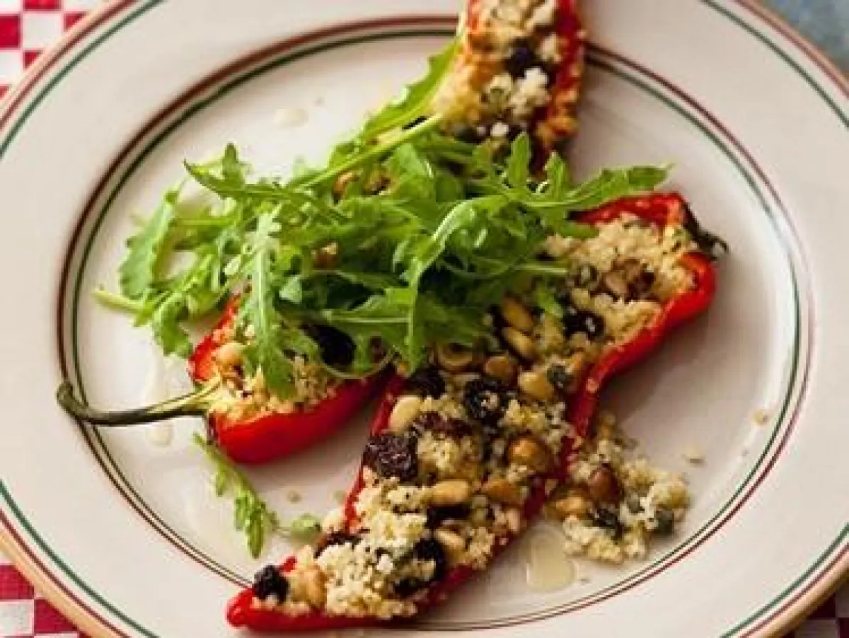 4-يستخرج العصير من صينية الفلفل، ويوضع على الكسكس، تضاف المكسرات والقبّار في حال استخدامه وأوراق النعناع المقطّعة. يتبّل بالملح والفلفل. ثم، يحشى الفلفل بمزيج الكسكس ويوضع في صينية الفرن.