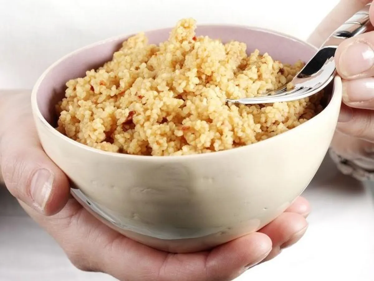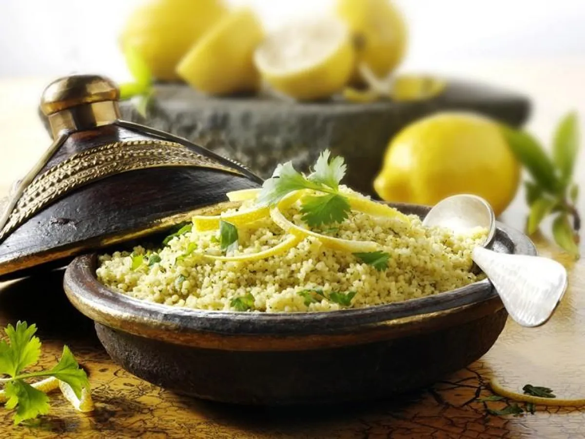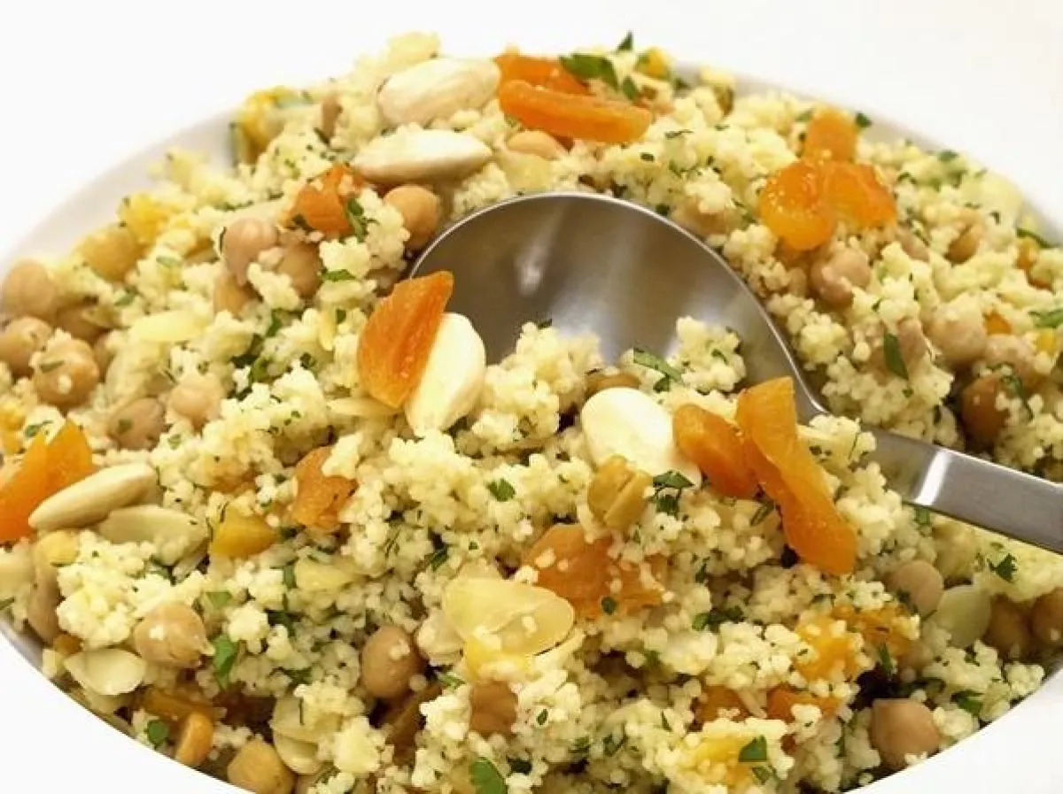 3-في غضون ذلك، يوضع الكسكس في قدر كبيرة، ويصبّ فوقه حوالي 200 ملليلتر من الماء المغلي.يحرّك فيه الزبيب، ويدع لمدّة 10 دقائق.