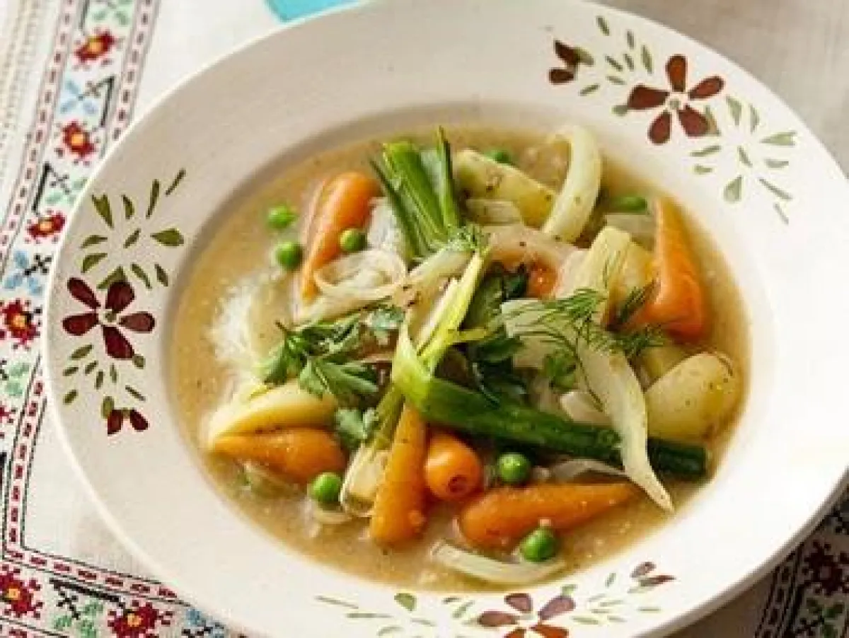 2-يصبّ المرق ويدع على نار هادئة. ثم، تضاف البطاطس، وبعد 5 دقائق يضاف الجزر، وبعد 5 دقائق إضافية يضاف كلّ من الشمر والكرّاث المفرومين. تغطّى القدر بصورة نصفية، ويطهى هذا المزيج لمدّة 5 دقائق.
