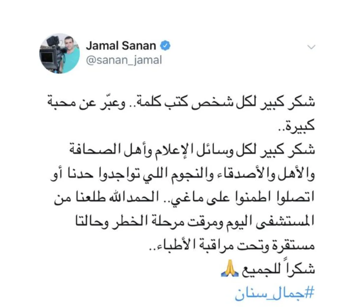 كما أوضح جمال سنان صاحب شركة "إيغل فيلمز" للإنتاج أن حالة زوجته الصحية مستقرة وهي تحظى بمتابعة الأطباء، وتقدم بالشكر إلى كل من تواجد إلى جانبها من أصدقاء وفنانين وإعلاميين وكل من كتب كلمة وعبّر عن محبته لها.