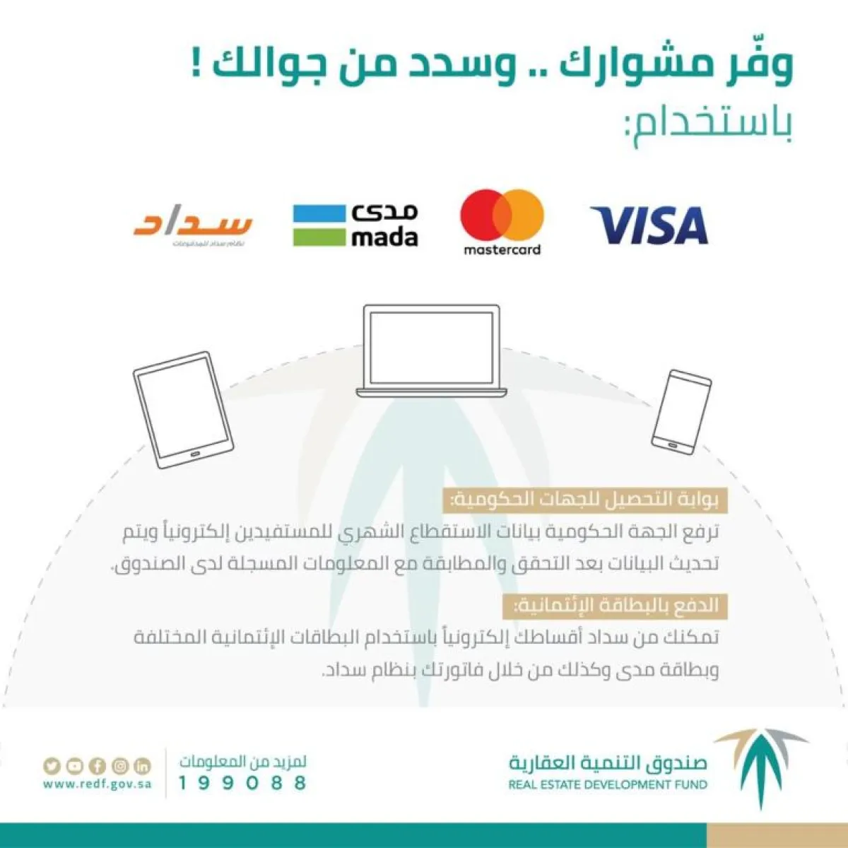 وأشار العصيمي، إلى أن الصندوق قام مؤخراً بإضافة خدمة "الدفع بالبطاقات الائتمانية" والتي تسمح للمستفيدين بدفع الفواتير من خلال بطاقة الائتمان (Visa أو MasterCard) أو بطاقة مدى بالإضافة إلى خدمة سداد، ويمكن للمستفيد من الصندوق الدخول عبر البوابة الإلكترونية للصندوق والدخول على قائمة الخدمات الإلكترونية واختيار خدمات المواطنين ومن ثم اختيار خدمة السداد وتسجيل الدخول إلى الخدمة ثم تحديد وسيلة الدفع من خلال اختيار سداد فاتورة ببطاقة ائتمانية ثم إدخال بيانات البطاقة والدفع.