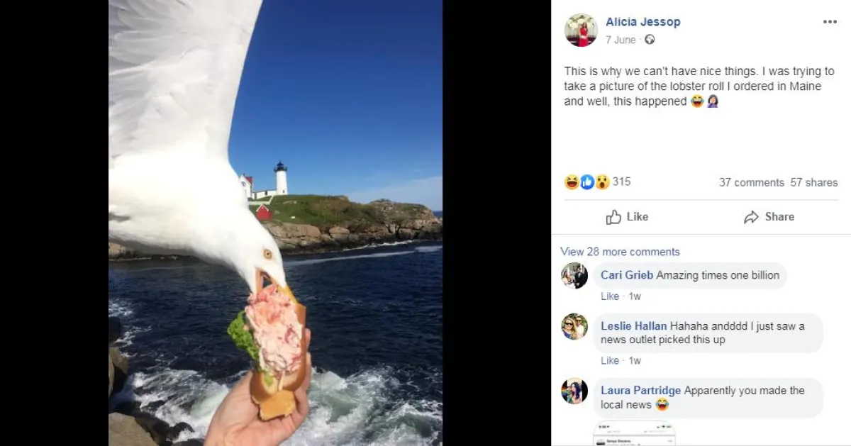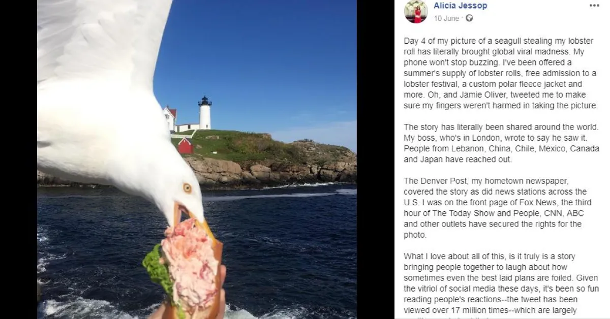 وبعد المفاجأة التي عاشتها «جيسوب» خلال تلك اللحظات، وسرقة النورس لشطيرتها، اكتشفت بأنها -عن غير قصد- التقطت صورة مذهلة للنورس في تلك اللحظة. وقامت أستاذة قانون الرياضة الأمريكية بنشر الصورة على صفحتها الخاصة عبر موقع التواصل الاجتماعي «فيسبوك»، وكتبت قائلة: «هذا هو السبب في أننا لا نستطيع الحصول على أشياء لطيفة. كنت أحاول أن التقط صورة للفافة جراد البحر التي طلبتها في «مين»، ولكن هذا ما حدث». ولكن لأن الشطيرة في «مين» لا تُفوت، دائماً هناك شطيرة ثانية، لذا اشترت «جيسوب» واحدة أخرى واستمتعت بتناولها، ونشرت صورتها وهي تفعل ذلك.