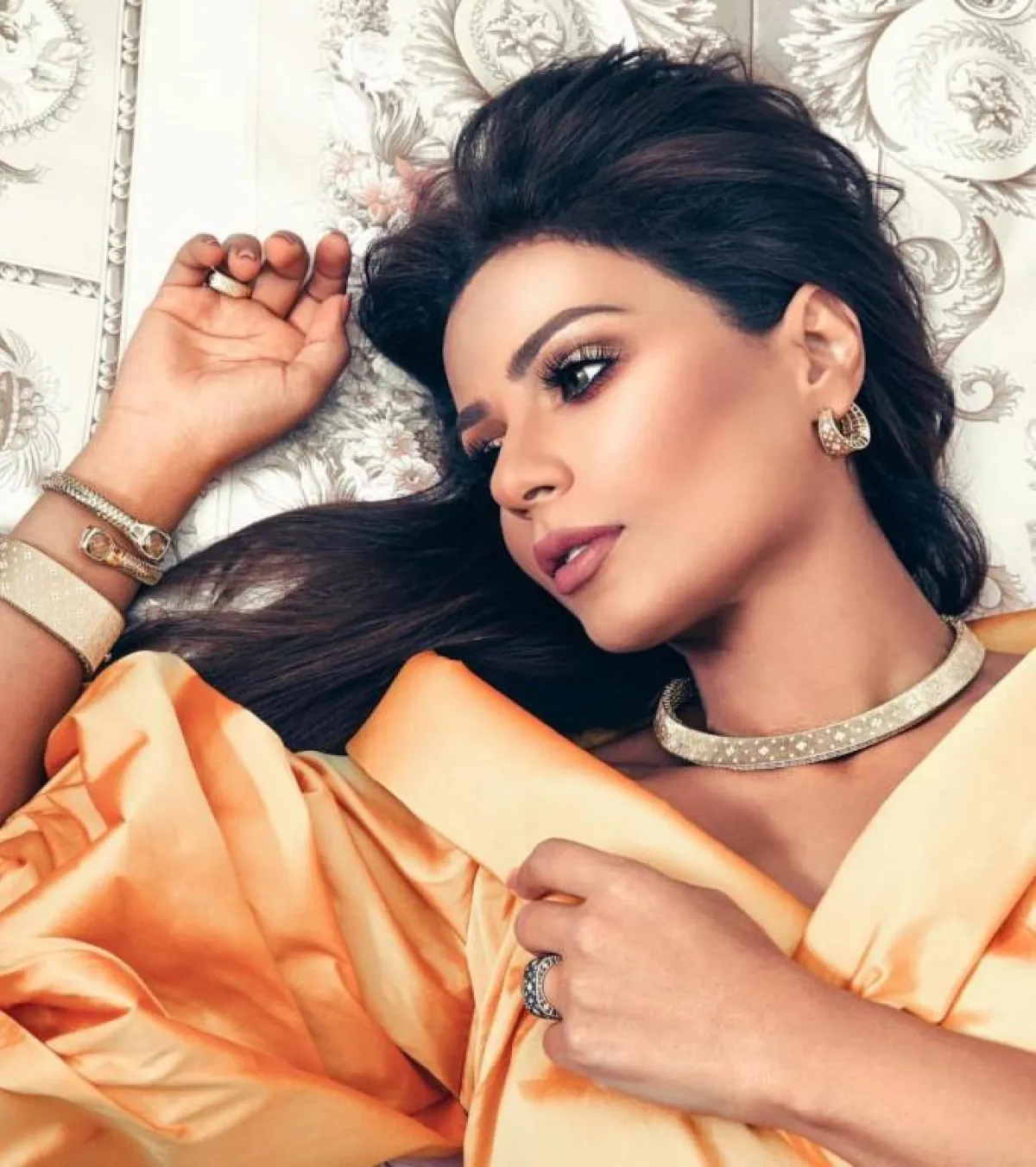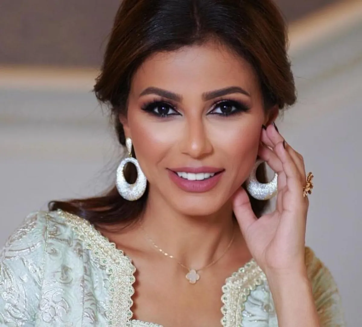 وأطلت بالعديد من المجوهرات الباهظة، منها طقم ناعم يحمل علامة وردة، مكون من خاتم وعقد ناعم، وارتدتْ أقراطًا طويلة وسوارًا ناعمة أنيقة، وظهرت بطقم فضي تزيِّنه ورود متتالية بأقراط طويلة وعقد دائري، وسوارًا تميل للضخامة وخاتم بزهور، وبدت في غاية الأنوثة والأناقة، كما ارتدتْ حلقًا طويلًا وعقدًا باللون الفضي، وتزينهما فصوص عدة ذهبية مميزة على شكل أوراق شجر.
