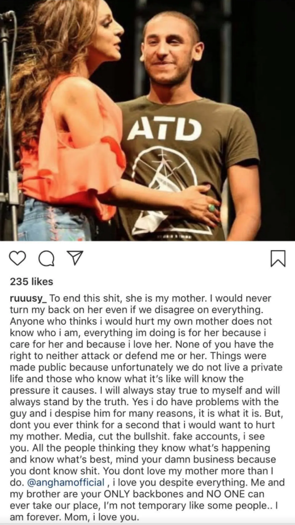 "لإنهاء كل هذا اللغط ، هي والدتي، ولن أدير لها ظهري أبدًا حتى لو لم نتوافق على كل شيء. أي شخص يعتقد أنني سوف أؤذي والدتي لا يعرف من أنا ، كل ما أفعله هو لأنني أهتم بها ولأنني أحبها. لا يحق لأي منكم مهاجمتي أو الدفاع عني. لقد تم نشر الأشياء على الملأ لأننا للأسف لا نعيش حياة خاصة سأظل دائماً صادقاً مع نفسي وسأظل دائماً إلى جانب الحقيقة".