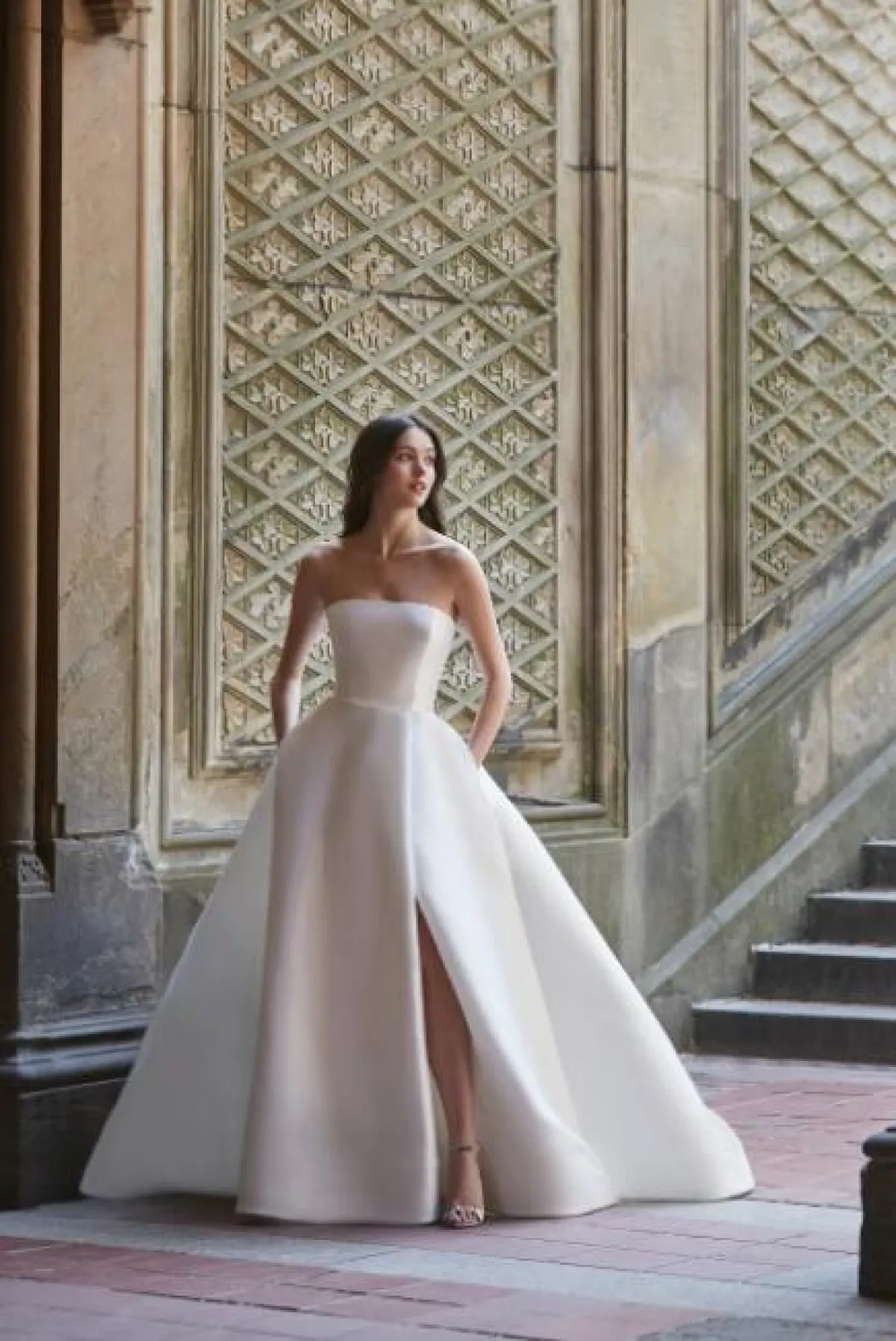 من أبسط التصميمات التي يمكنكِ اعتمادها بفساتين الزفاف، هو هذا الموديل من Bliss Monique Lhuillier والذي يكون مصنوعًا من خامة الساتان السميكة، التي تخفي عيوب الجسم، وهذه الجيوب العصرية أضافت لمسة أنيقة للوك المخملي، بخاصة مع فتحة الساق الجريئة للعروس صاحبة الذوق غير التقليدي.