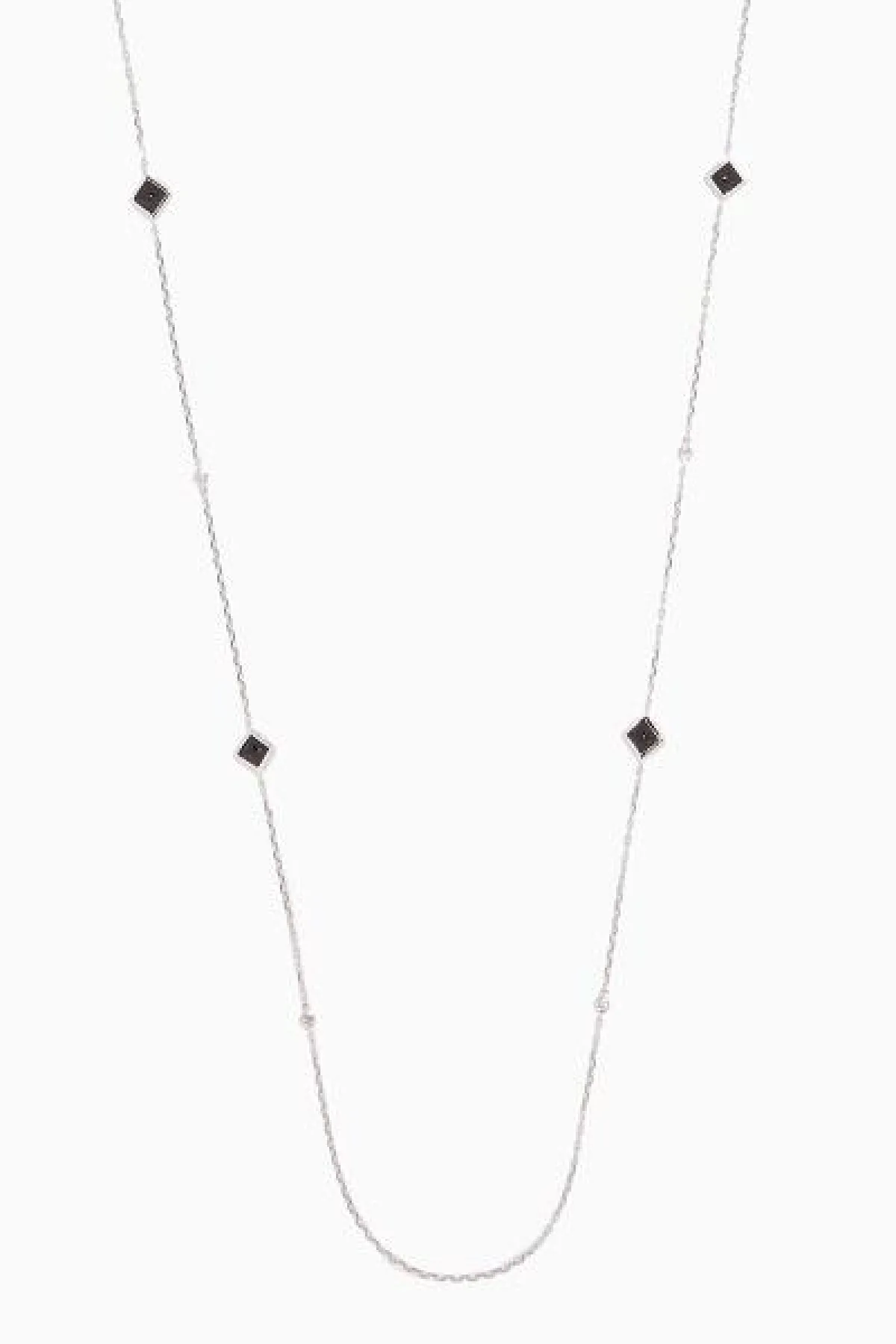 تضفي سلسلة الذهب الطويلة Cleo الساحرة والأنيقة من علامة مجوهرات مارلي Marli لمسة مميزة إلى إطلالات النهار وحتى السهرات. تم تصميمها من الذهب الأبيض عيار 18 قيراطاً وترصيعها بحجر العقيق الأسود الهرمي على سلسلة دقيقة وطويلة. أما الألماسات البراقة فتضفي عليها لمسة أنيقة.