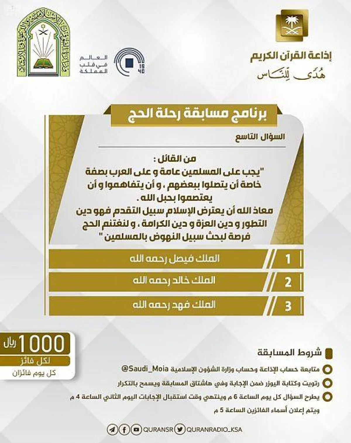 وأشارت وزارة الشؤون الإسلامية، إلى أنه سيتم استقبال الإجابات فور طرح السؤال في الساعة 6 مساءً، وحتى اليوم الثاني في الساعة 4 مساء، ويتم السحب على فائزين يومياً ويحصل كل منها على مبلغ 1000 ريال حيث يتم الإعلان عنهم في حلقة اليوم الثاني في تمام الساعة الخامسة عصرًا طيلة فترة المسابقة.