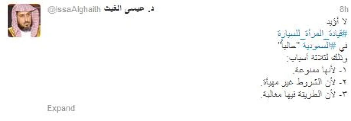 كشف عضو مجلس الشورى، الدكتور عيسى الغيث، عبر حسابه الشخصي بـ «تويتر» أنَّه لا يؤيد قيادة النساء للسيارات داخل المملكة لأسباب ثلاثة، الأول لأنَّها ممنوعة، والثاني لأنَّ الظروف غير مهيأة، والثالث لأنَّ الطريقة فيها مغالبة.