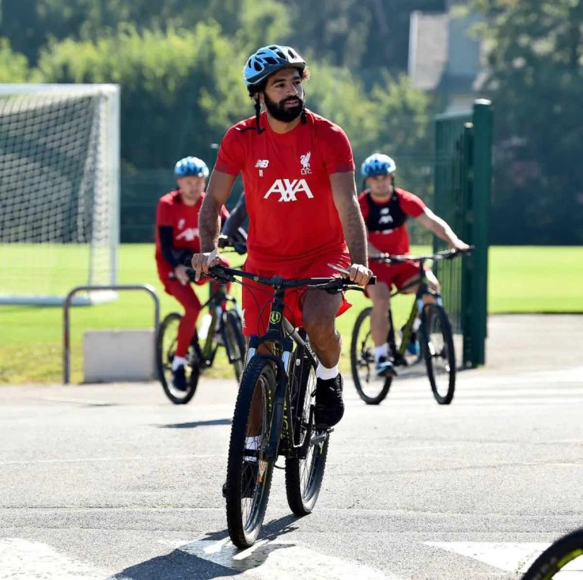 وظهر محمد صلاح وهو يقود الدراجة في إنجلترا، واليوم ظهر وهو مع زملائه في فريق ليفربول الإنجليزي، وهم يقومون بممارسة قيادة الدراجات في المعسكر التدريبي في فرنسا.