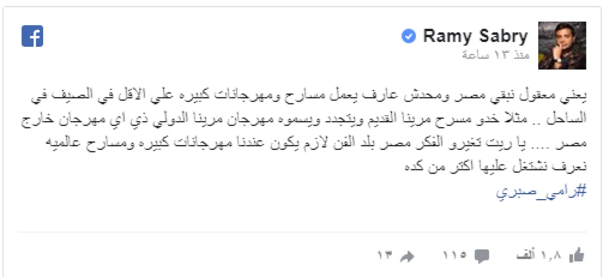 وكتب رامي صبري عبر صفحته الرسمية على موقع الفيس بوك قائلا: يعني معقول نبقي مصر ومحدش عارف يعمل مسارح ومهرجانات كبيرة على الأقل في الصيف في الساحل، مثلا خدو مسرح مرينا القديم ويتجدد ويسموه مهرجان مرينا الدولي ذي أي مهرجان خارج مصر، يا ريت تغيرو الفكر مصر بلد الفن لازم يكون عندنا مهرجانات كبيرة ومسارح عالميه نعرف نشتغل عليها اكتر من كده.